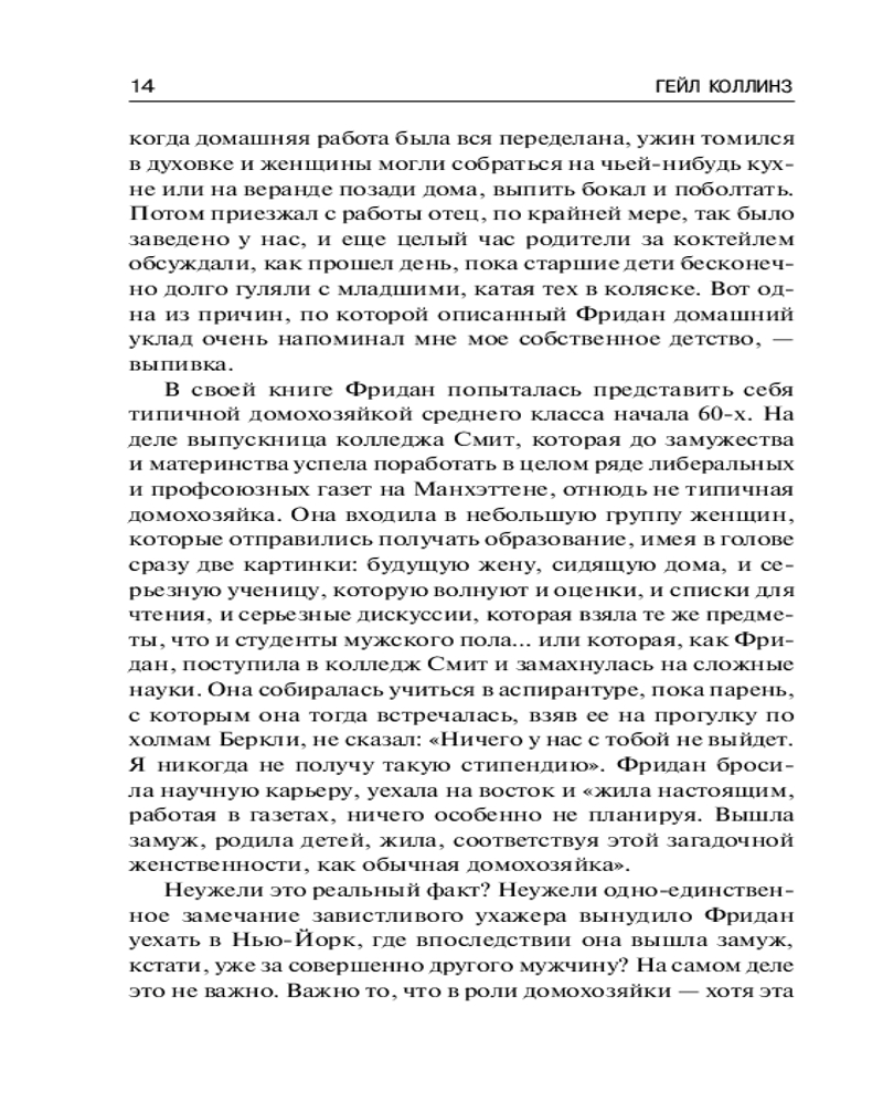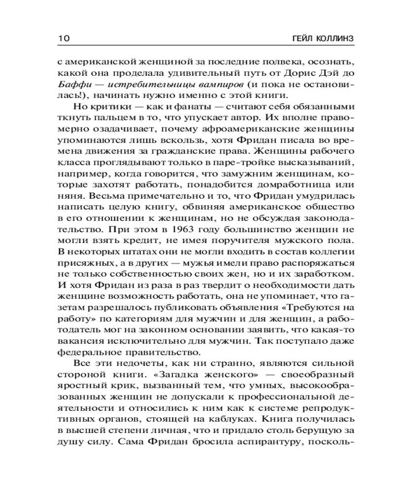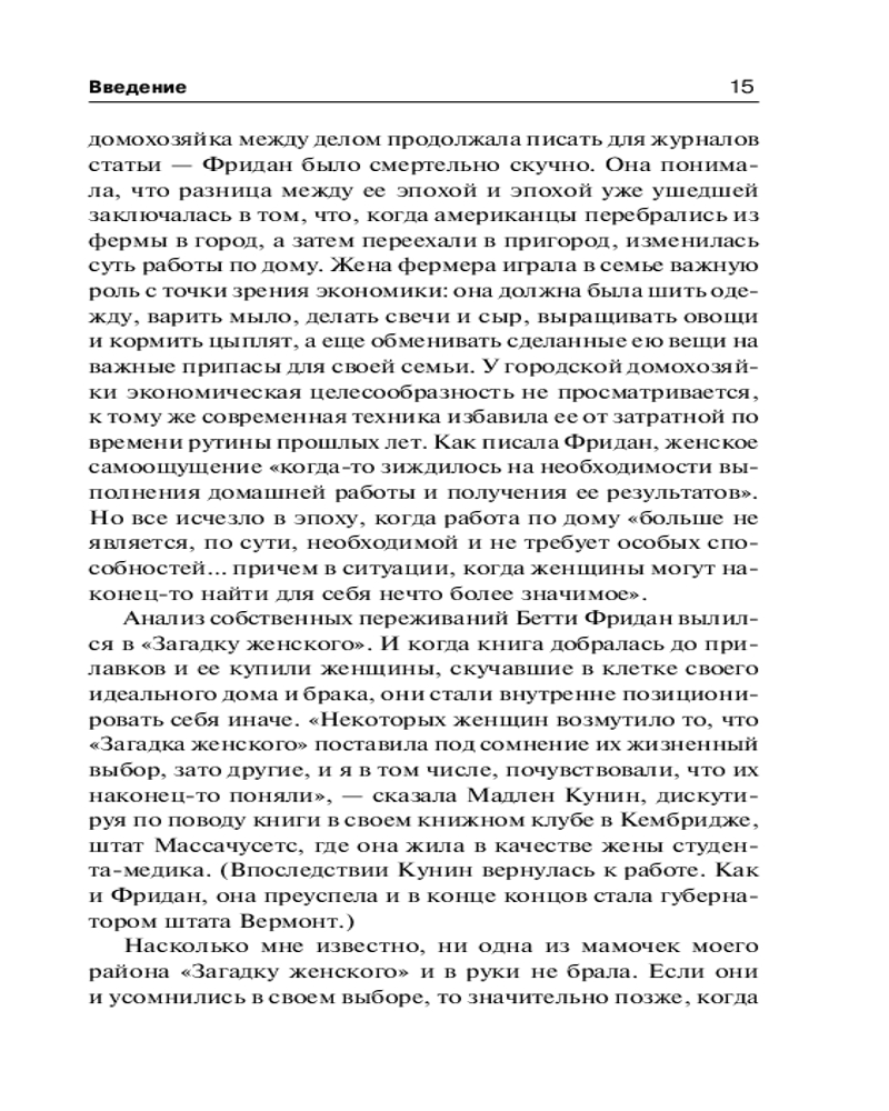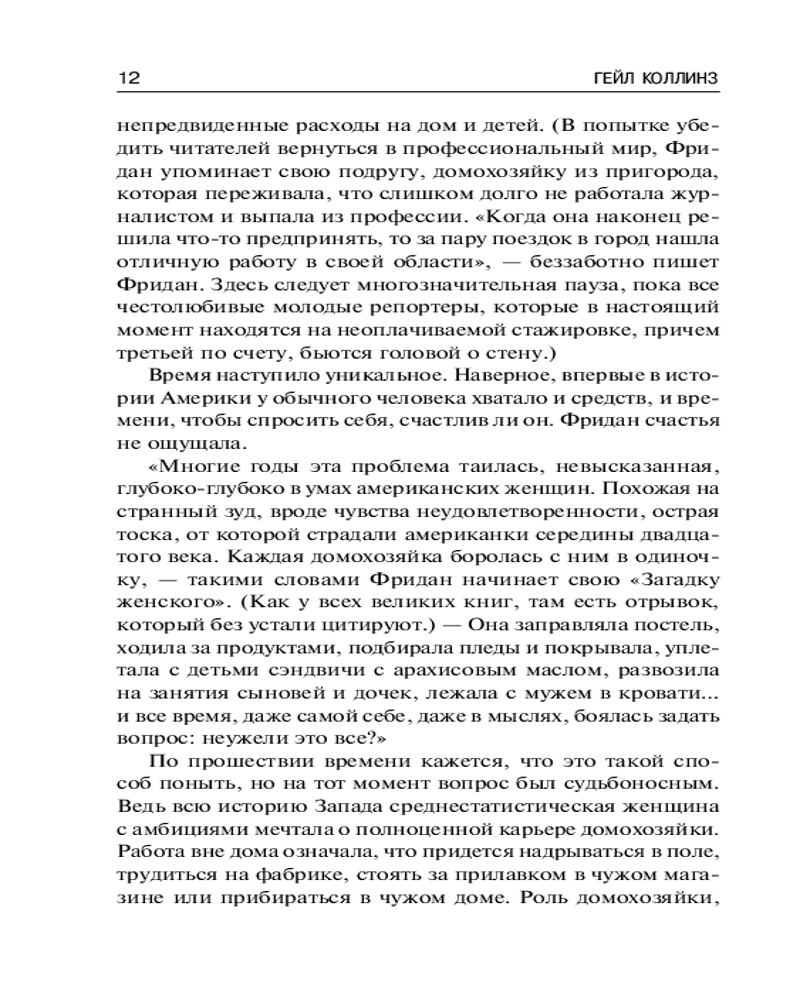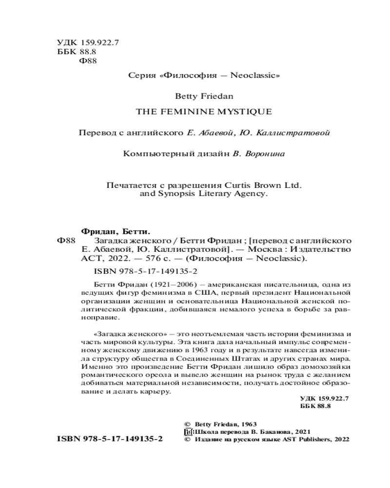 «Загадка женского» — это неотъемлемая часть истории феминизма и часть мировой культуры. Эта книга дала начальный импульс современному женскому движению в 1963 году и в результате навсегда изменила структуру общества в Соединенных Штатах и других странах мира. Именно это произведение Бетти Фридан лишила образ домохозяйки романтического ореола и вывела женщин на рынок труда с желанием добиваться материальной независимости, получать достойное образование и делать карьеру. |
