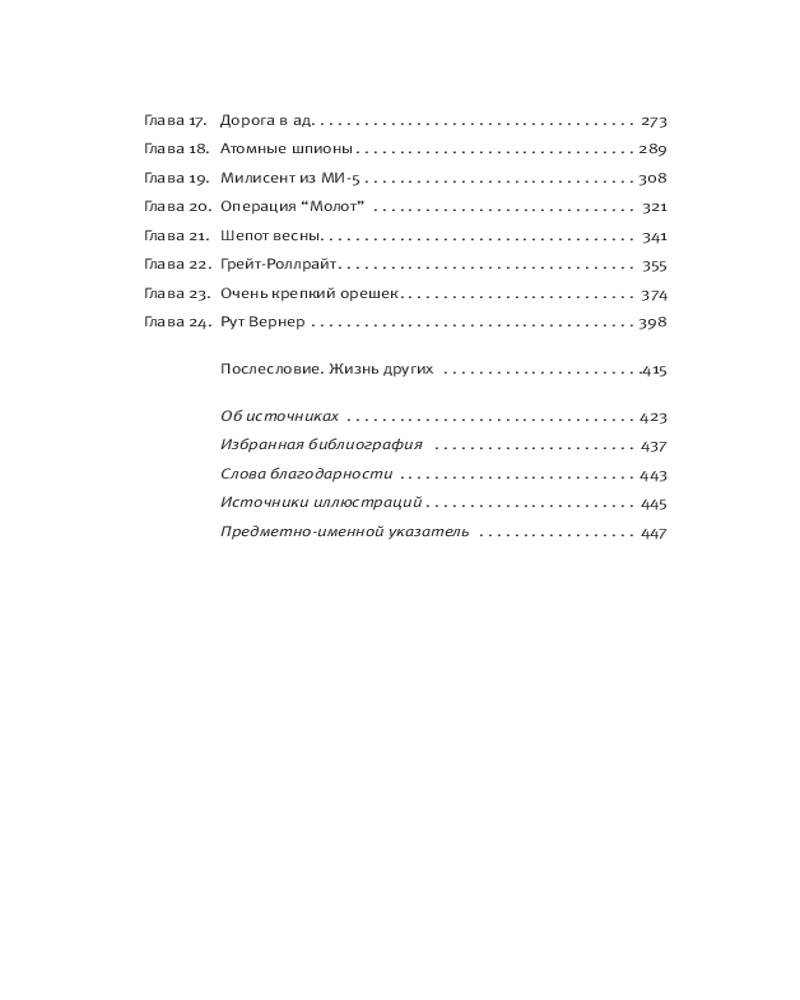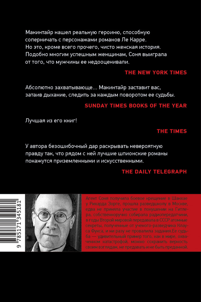 В книге показан весь путь Урсулы Кучински от простой подчиненной до опытной разведчицы. Бен Макинтайр мастерски раскрывает многогранность ее жизни и связанные с этим внутренние конфликты. Долг перед идеей и перед семьей, любовь и разлука, страх преследования и неутомимое жизнелюбие — все это составляет жизнь удивительной женщины, которой удалось сохранить себя в самом эпицентре катастроф двадцатого века. |