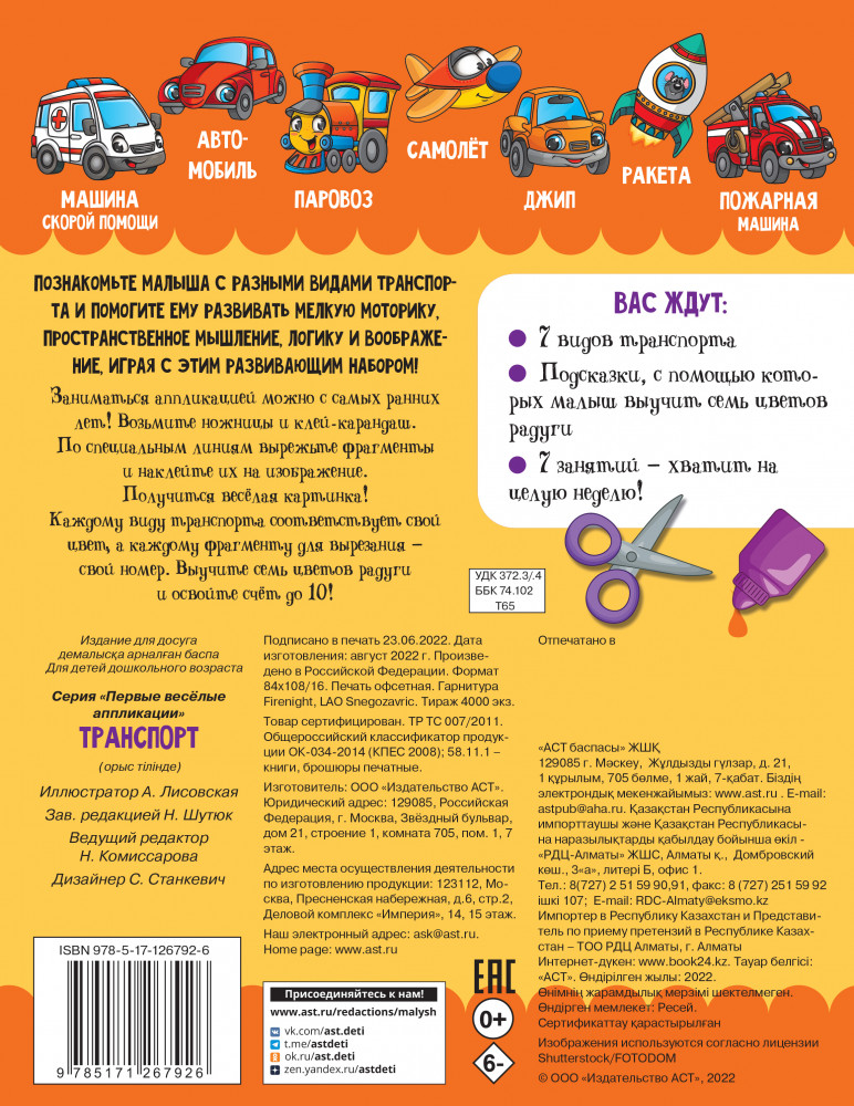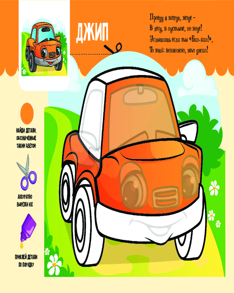 ТранспортВ данный момент этот товар отсутствует в продаже. Возможно, у нас найдется аналогичный или похожий товар здесь. Серия: Первые веселые аппликации Познакомьте малыша с разными видами Транспорта и помогите ему развивать мелкую моторику, пространственное мышление, логику и воображение, играя с этим развивающим набором! Вас ждут 7 милых машинок, а также подсказки, с помощью которых малыш выучит семь цветов радуги и счет до 10. В книге 7 занятий — хватит на целую неделю! |