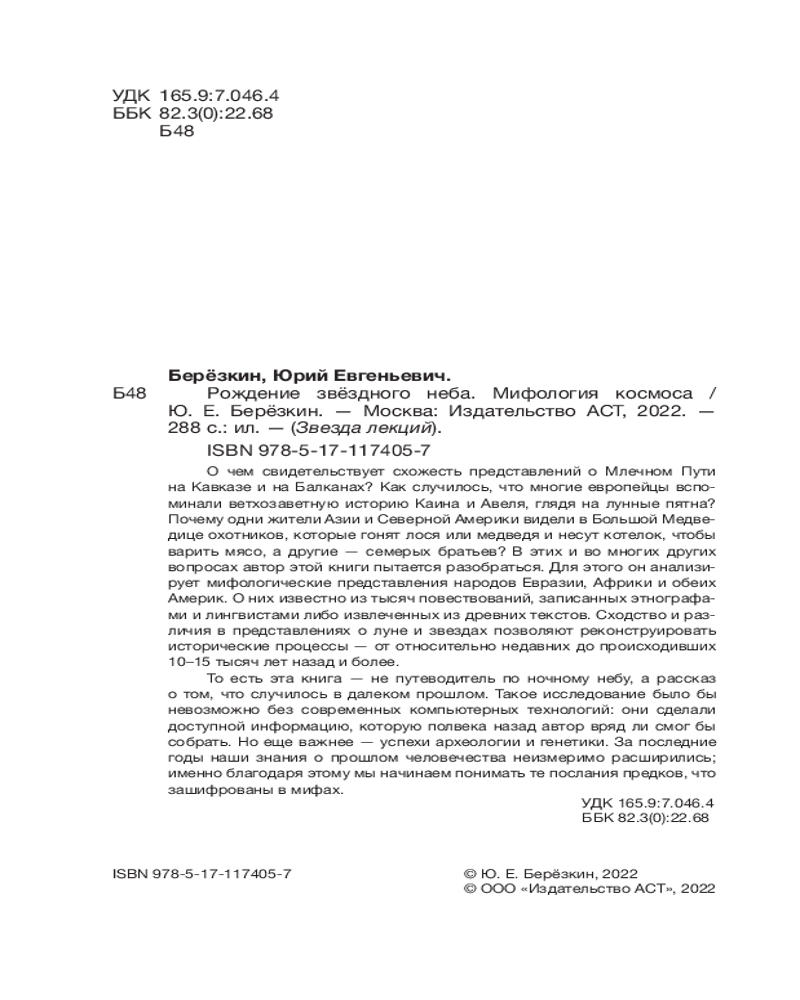 Серия: Звезда лекций О чем свидетельствует схожесть представлений о Млечном Пути на Кавказе и на Балканах? Как случилось, что многие европейцы вспоминали ветхозаветную историю Каина и Авеля, глядя на лунные пятна? Почему одни жители Азии и Северной Америки видели в Большой Медведице охотников, которые гонят лося или медведя и несут котелок, чтобы варить мясо, а другие — семерых братьев? В этих и во многих других вопросах автор этой книги пытается разобраться.