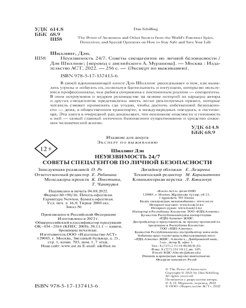 Серия: Эксперт по выживанию Дэн Шиллинг — писатель и спецагент, выполнявший боевые и секретные миссии по всему миру. Он основал, а затем возглавил две эскадрильи специальных операций и работал вместе с ЦРУ и ФБР над уничтожением террористов, а также биологического и ядерного оружия. Своими уникальными навыками предотвращения опасности и обеспечения собственной безопасности он делится с читателем в этой книге. |