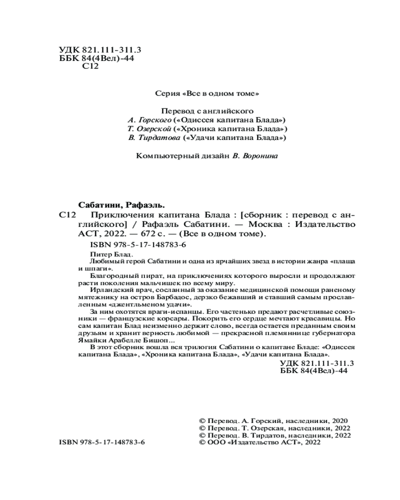 В этот сборник вошла вся трилогия Сабатини о капитане Бладе: «Одиссея капитана Блада», «Хроника капитана Блада», «Удачи капитана Блада». |