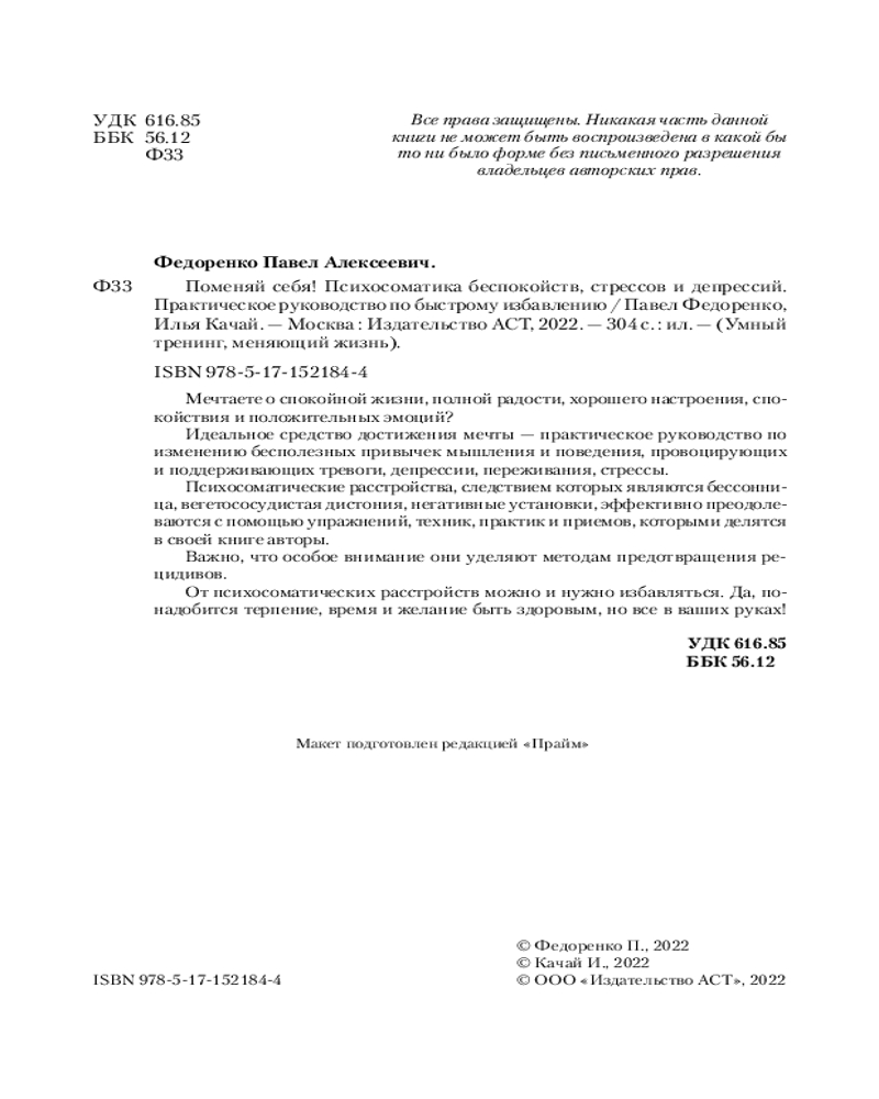 | Поменяй себя! Психосоматика беспокойств, стрессов и депрессий. Практическое руководство по быстрому избавлению Павел Алексеевич Федоренко, Илья Сергеевич Качай