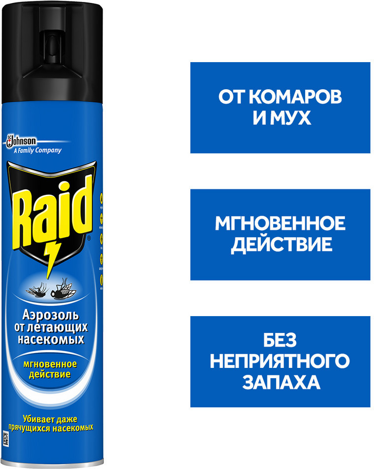 Raid Аэрозоль от летающих насекомыхбыстро устраняет объём запах для помещений В данный момент этот товар отсутствует в продаже. Возможно, у нас найдется аналогичный или похожий товар здесь. Аэрозоль против летающих насекомых Raid — защитное средство от летающих насекомых в помещении. Убивает комаров, мух, ос, шершней, моли. Убивает даже прячующихся насекомых. Возможно использование внутри жилых комнат, а также на кухне. Имеет приятный легкий аромат. |