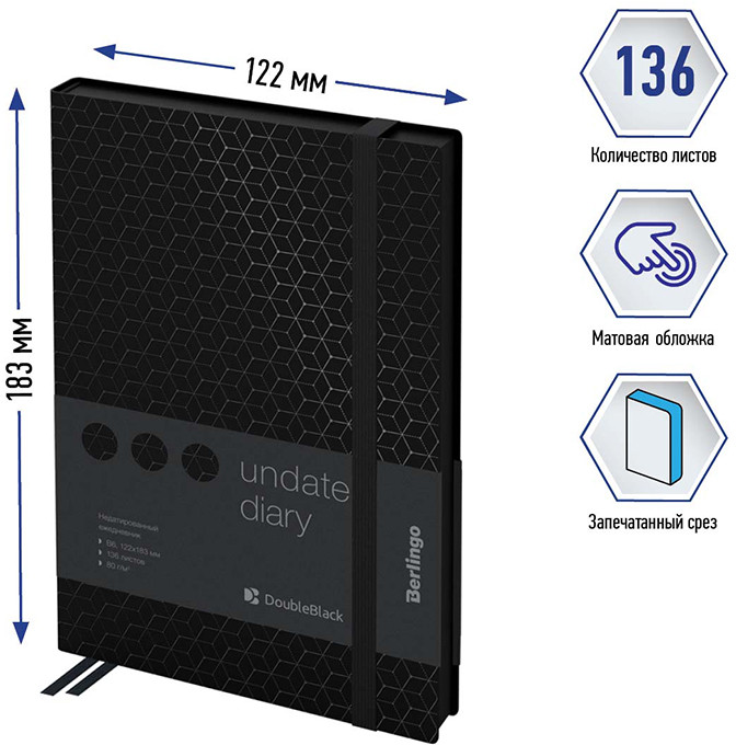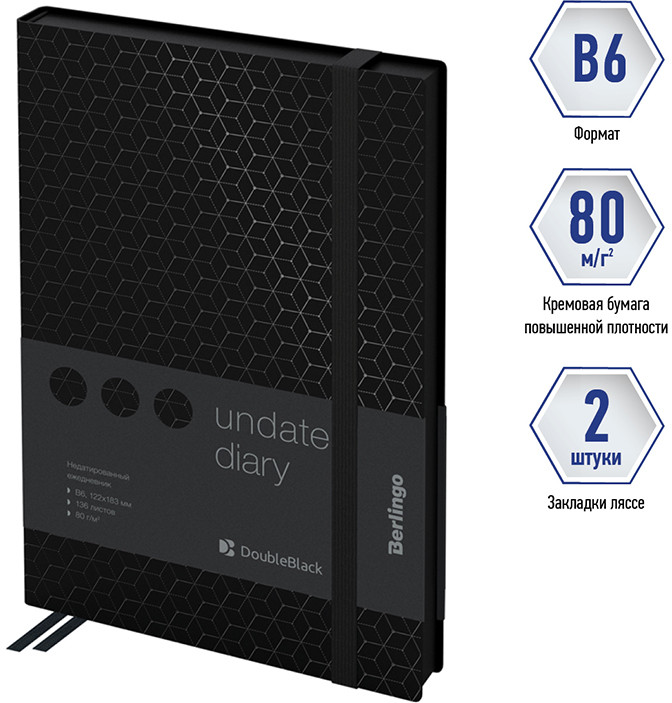 💳 Оплатить за товар можно при получении 🇰🇿 Есть бесплатная доставка по Казахстану 🎁 Копите бонусы с каждой покупки Стильные ежедневники Berlingo DoubleBlack с полужесткой обложкой из высококачественного soft-touch кожзаменителя с черным срезом. Вертикальная фиксирующая резинка увеличенной толщины 9 миллиметров. Имиджевый рисунок лаком по всей площади обложки. Внутренний карман для хранения заметок и мелочей. Внутренний блок из 136 листов высококачественной кремовой бумаги повышенной плотности 80 г/м², пантонная печать в 2 краски, справочный материал. Перфорированные уголки блока. 2 закладки-ляссе. Отрывные заметки и бланки извещения о ДТП. Прошитый блок. Подходит под персонализацию. |