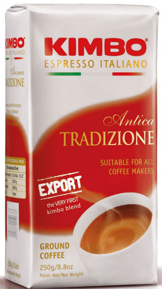 Kimbo Export Antica Tradizione — натуральный молотый кофе премиум класса, купаж из высококачественных сортов бразильской арабики и отборной африканской робусты. Напиток имеет гладкую структуру, интенсивный глубокий аромат, насыщенный вкус с шоколадными нотками, густую плотную крема. Export Antica Tradizione — прекрасное начало нового дня, придает бодрости и энергии.
