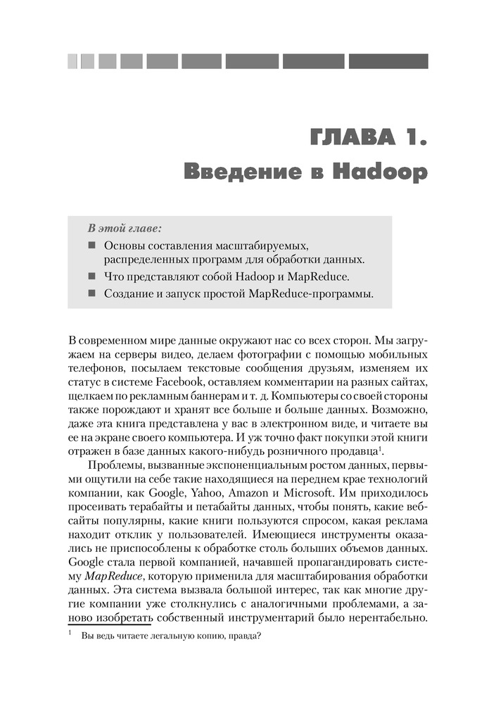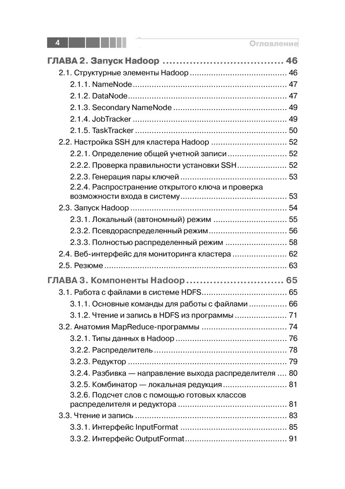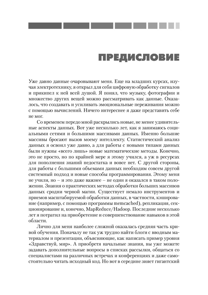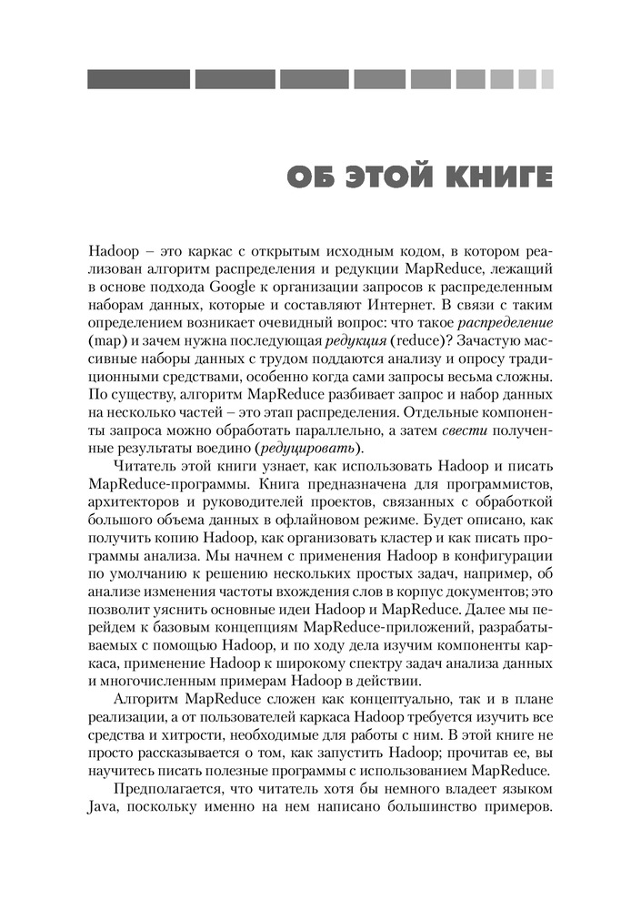 💳 Оплатить за товар можно при получении 🇰🇿 Есть бесплатная доставка по Казахстану от 1 дня 🎁 Копите бонусы с каждой покупки Обработка больших массивов данных с помощью традиционных СУБД может оказаться трудным делом. Apache Hadoop — это каркас для разработки приложении, предназначенных для выполнения в распределенном кластере, без применения SQL. Такие приложения прекрасно масштабируются и могут обрабатывать гигантские массивы данных. Если вам требуется произвести анализ данных, то Hadoop как раз то, что надо. Прочитав эту книгу, вы познакомитесь с предметом и научитесь писать программы в стиле MapReduce. После нескольких простых примеров автор быстро переходит к вопросу об использовании Hadoop для решения более сложных задач анализа данных. Описываются рекомендованные приемы и паттерны проектирования, полезные при программировании для MapReduce. Для чтения книги требуется знание основ языка Java. Некоторое знакомство с математической статистикой поможет разобраться в более сложных примерах. |