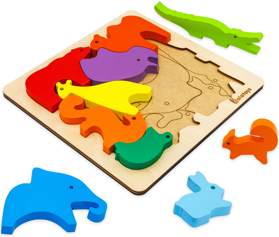 Особенностью этого танграма является возможность играть как с самой доской, куда необходимо уложить фигуры, так и с фигурами по отдельности. Простые фигурки позволяют познакомить ребёнка с силуэтами животных, развивают пространственное мышление и мелкую моторику рук.