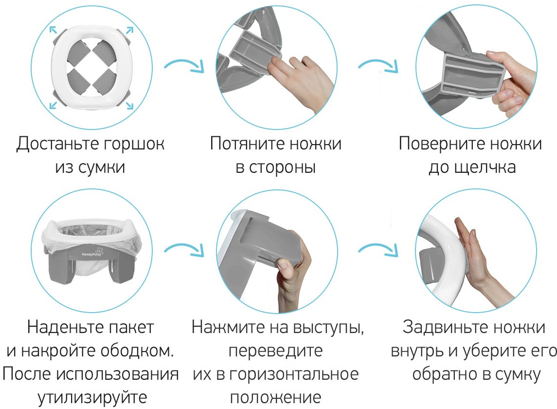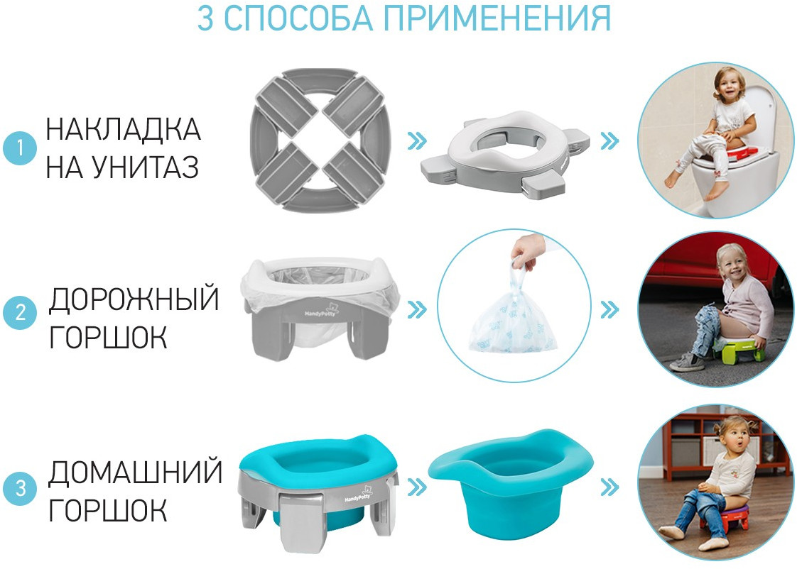 💳 Оплатить за товар можно при получении 🇰🇿 Есть бесплатная доставка по Казахстану от 1 дня 🎁 Копите бонусы с каждой покупки Дорожный горшок для детей «Handy Potty» поможет обеспечить дополнительный комфорт в путешествиях с маленькими детьми. Это простое приспособление сочетает в себе функции трех аксессуаров: обычного горшка, дорожного горшка и адаптера для унитаза, что делает горшок HandyPotty универсальным. В комплекте с этой моделью поставляется многоразовая вкладка: теперь её не нужно покупать отдельно. Дорожный горшок представлен в сером цвете, вкладка – мятного цвета. |