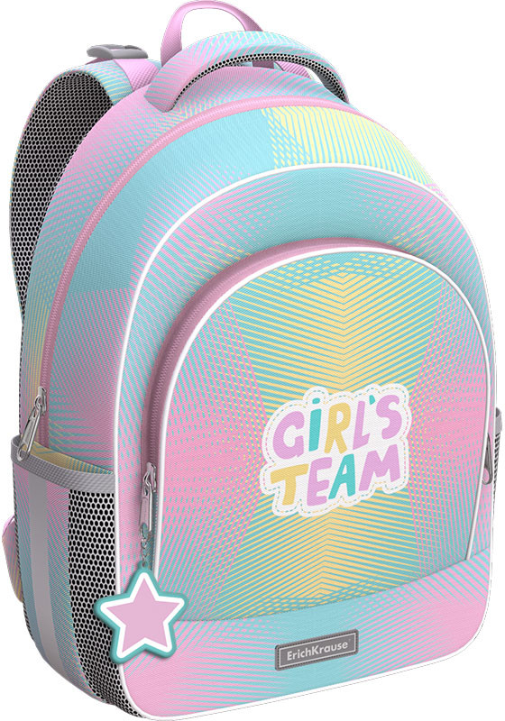 Каркасный рюкзак с эргономичной спинкой. Одно вместительное отделение, внутри эластичный фиксатор для тетрадей и учебников формата А4, карман на молнии и мини-органайзер. На дне жёсткая откидная вставка. Снаружи фронтальный карман на надёжной молнии с мягким ходом и два боковых кармана на резинке для бутылки с водой или зонтика.