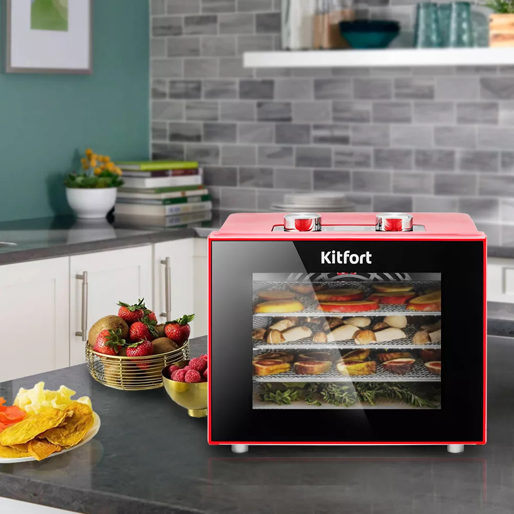 С электросушилкой Kitfort KT-1915 у вас под рукой всегда будет живая еда. Сушилка быстро насушит вам фрукты, овощи и ягоды, сохраняя их полезные свойства, а с помощью специального поддона для жидкости можно приготовить домашнюю пастилу.