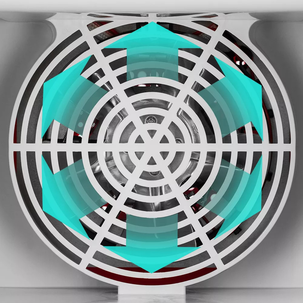 Сушилка оборудована большим мощным вентилятором, что обеспечивает равномерный обдув всех 5 поддонов. Поток воздуха направлен горизонтально, поэтому запахи продуктов с разных поддонов не смешиваются.