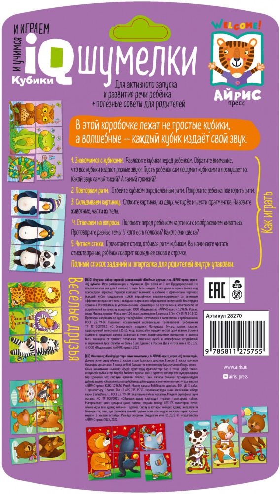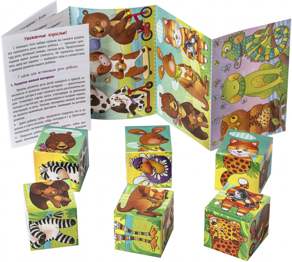 💳 Оплатить за товар можно при получении 🇰🇿 Есть бесплатная доставка по Казахстану от 1 дня 🎁 Копите бонусы с каждой покупки Серия: IQ Кубики Набор состоит из 6 кубиков с изображением животных. Можно сложить картинки из 2, 4, 6 фрагментов. Благодаря различным наполнителям каждый кубик издаёт свой звук. Ребёнок учится различать звуки, их громкость, отбивать ритм, слушает ритмические стихи. В процессе игры развиваются фонематический слух, активная речь, мышление, умение работать по образцу, происходит знакомство с понятиями «часть и целое». Наклейки на кубики сделаны из качественной гладкой бумаги, которая не портится от игры. |