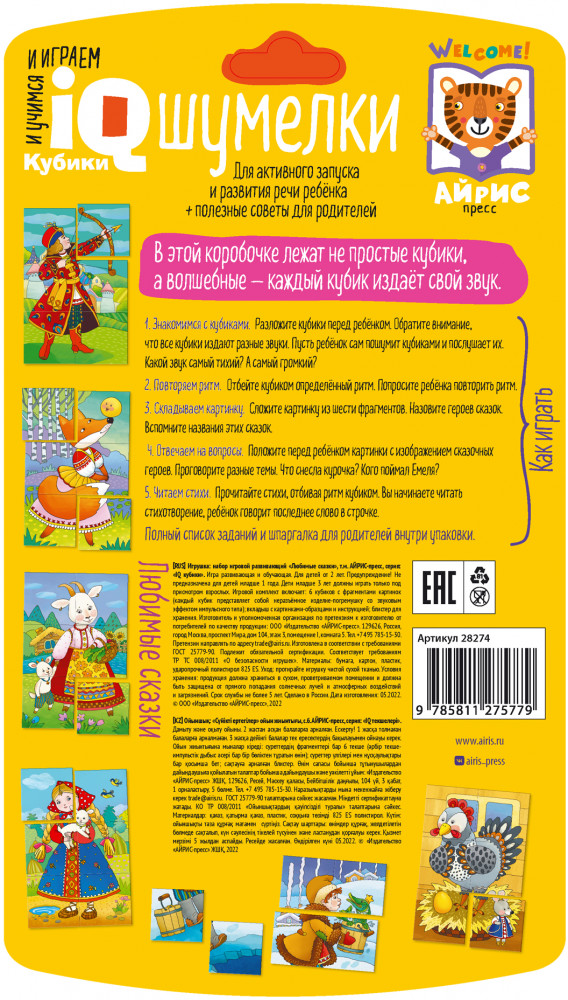💳 Оплатить за товар можно при получении 🇰🇿 Есть бесплатная доставка по Казахстану от 1 дня 🎁 Копите бонусы с каждой покупки Серия: IQ Кубики Набор состоит из 6 кубиков, из которых можно сложить 6 картинок с изображением героев русских сказок. Благодаря различным наполнителям каждый кубик издаёт свой звук. Ребёнок учится различать звуки, их громкость, отбивать ритм, слушает ритмические стихи. В процессе игры развиваются фонематический слух, активная речь, мышление, умение работать по образцу, происходит знакомство с понятиями «часть и целое». Наклейки на кубики сделаны из качественной гладкой бумаги, которая не портится от игры. |