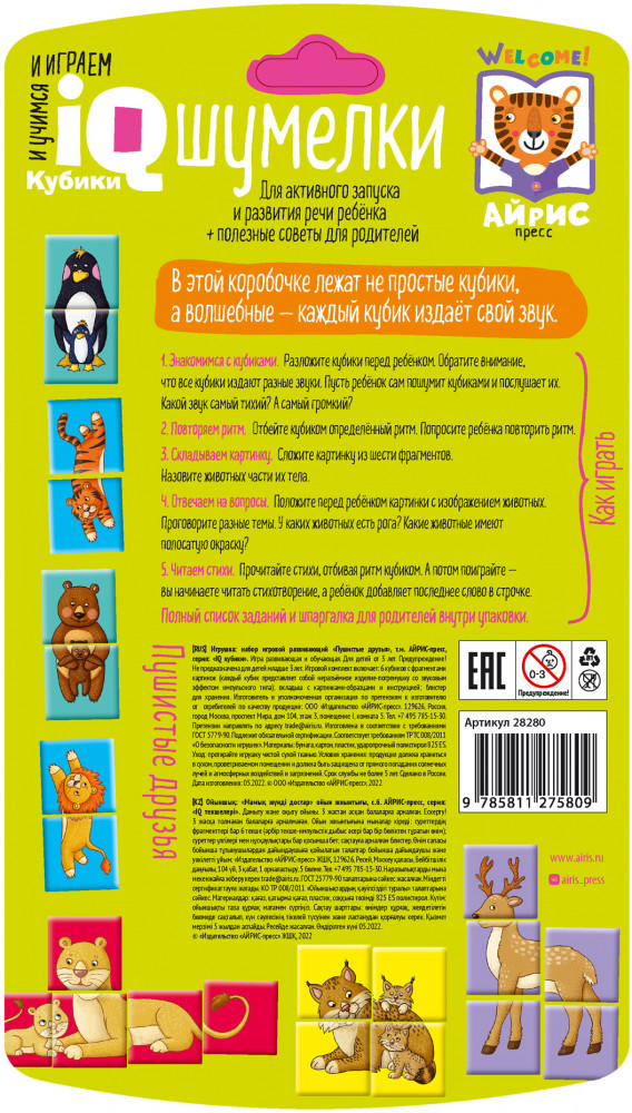 💳 Оплатить за товар можно при получении 🇰🇿 Есть бесплатная доставка по Казахстану от 1 дня 🎁 Копите бонусы с каждой покупки Серия: IQ Кубики Набор состоит из 6 кубиков, из которых можно сложить 6 картинок с изображением животных. Особенность кубиков в том, что картинки складываются в форме не только привычного прямоугольника, но и других фигур. Благодаря различным наполнителям каждый кубик издаёт свой звук. Ребёнок учится различать звуки, их громкость, отбивать ритм, слушает ритмические стихи. В процессе игры развиваются фонематический слух, активная речь, мышление, умение работать по образцу, происходит знакомство с понятиями «часть и целое». Наклейки на кубики сделаны из качественной гладкой бумаги, которая не портится от игры. |