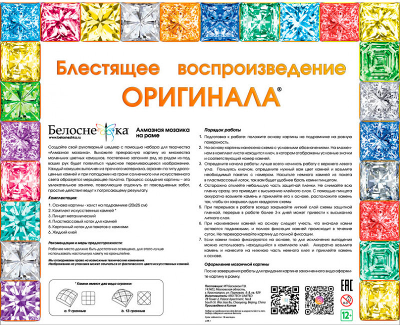Веселый детский сюжет в алмазной мозаике от Белоснежки. В комплекте есть все необходимое для создания картины, просто откройте набор и можно приступать к творчеству! Удобная для работы основа картины на подрамнике — комфортно собирать, легко размещать. Набор квадратных камней из прочного композитного материала на основе эпоксидной смолы, камни расфасованы по цветам в пакетики с zip-застежкой и на каждом пакете есть наклейка с номером цвета и условным обозначением как на схеме. |