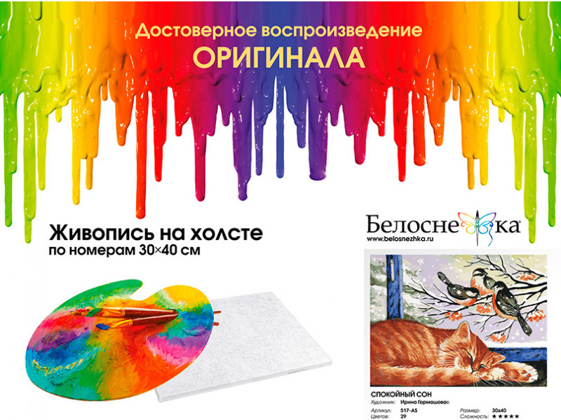 Живопись на холсте от Белоснежки — это интересные авторские сюжеты и увлекательное погружение в мир творчества. Вы любите животных? А теперь попробуйте создать акриловыми красками настоящую картину из жизни наших маленьких друзей. Приготовьте стакан воды и бумажную салфетку, остальное уже есть в комплекте! Вы не уверены в своих силах и не знаете понравится вам или нет? Просто купите набор для рисования по номерам и убедитесь, что рисовать по номерам на холсте это просто, интересно и доступно для всех возрастов!