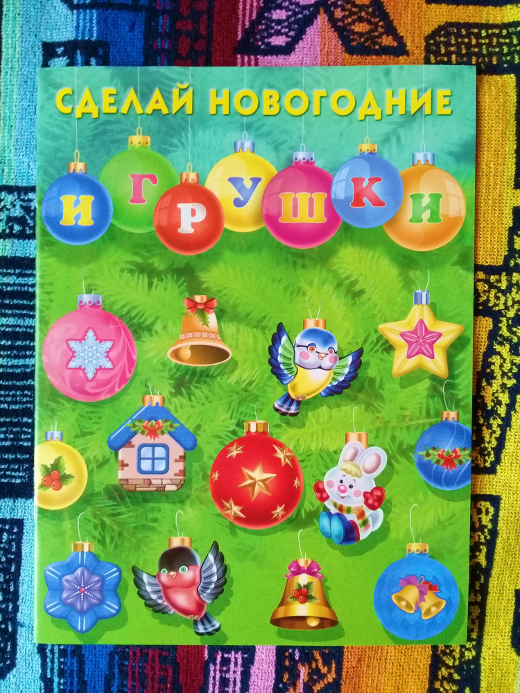 «Сделай новогодние игрушки» Количество страниц: 16 Очень милые игрушки получились. Конечно, бумажные и, может быть, не такие яркие, но как раз в этом есть своя прелесть. Хотелось сделать что-то подобное, и чтобы уже были готовые изображения. Ёлочные шары, звёздочки, колокольчики, птички, зайчик, сосулька, ёлочки и домики. Всего 23 игрушки, довольно больших по размеру. Бумага плотная. Прежде, чем приступить к творческому процессу, прочитала зимние и новогодние стихи русских поэтов, которые содержатся в издании. Вдохновляюще. Вырезала игрушки по контуру. В середину каждой поделки заложила нитку, примерно в центр. Склеила обе половинки игрушки, наверху оставила место, чтобы нитка могла немного передвигаться в обе стороны (такой совет был в инструкции, в книге). Изделия положила под пресс на три дня. Излишки обрезала. Результатом довольна. Красота! Издание: «Фламинго», 2021. Художник: И.Н. Приходкин.