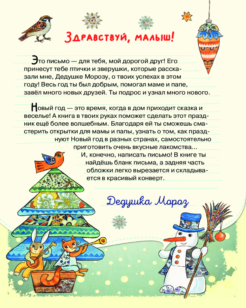 💳 Оплатить за товар можно при получении 🇰🇿 Есть бесплатная доставка по Казахстану от 1 дня 🎁 Копите бонусы с каждой покупки Серия: Волшебный праздник Новый год — это время, когда в дом приходит сказка и веселье! А эта книга поможет сделать праздник ещё более волшебным. Благодаря ей можно смастерить открытки для мамы и папы, узнать о том, как празднуют Новый Год в разных странах, самостоятельно приготовить очень вкусные лакомства... И, конечно, написать письмо Деду Морозу! В книге есть бланк письма, а задняя часть обложки легко вырезается и складывается в красивый конверт. |