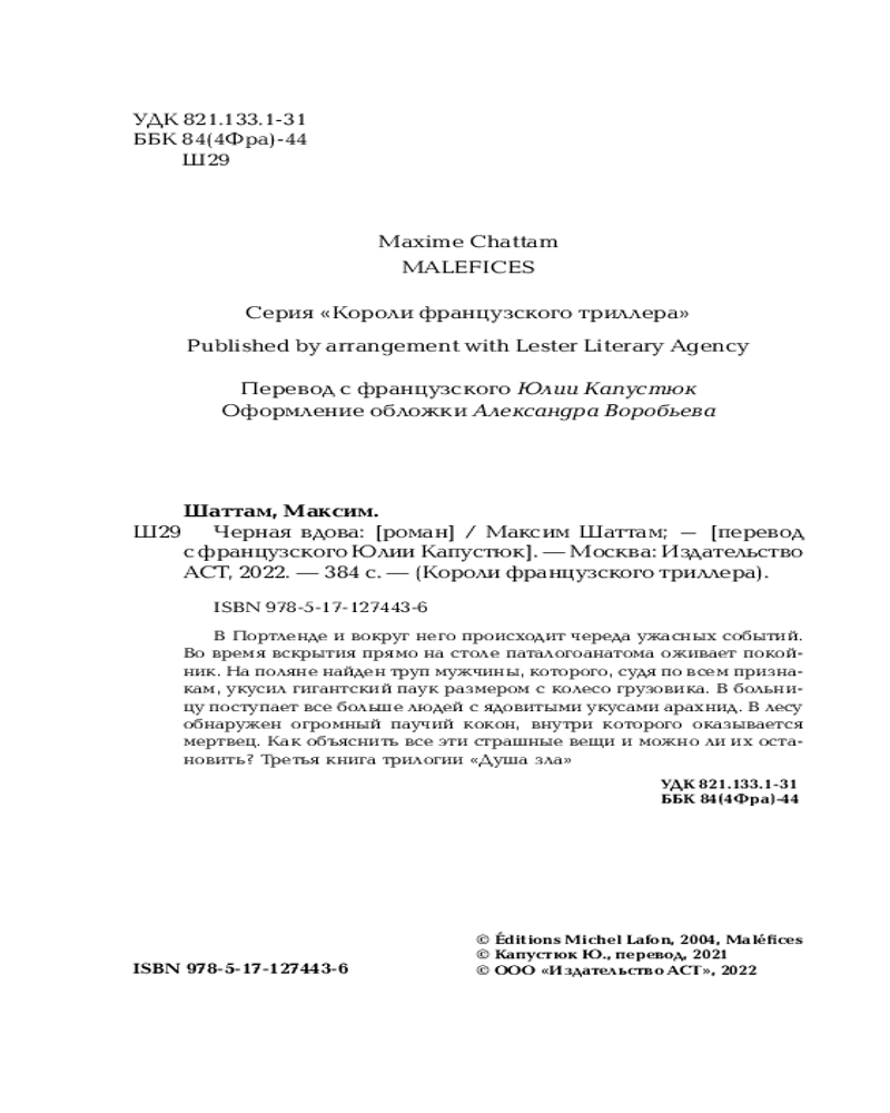 💳 Оплатить за товар можно при получении 🇰🇿 Есть бесплатная доставка по Казахстану от 1 дня 🎁 Копите бонусы с каждой покупки Серия: Короли французского триллера В Портленде и вокруг него происходит череда ужасных событий. Во время вскрытия прямо на столе паталогоанатома оживает покойник. На поляне найден труп мужчины, которого, судя по всем признакам, укусил гигантский паук размером с колесо грузовика. В больницу поступает все больше людей с ядовитыми укусами арахнид. В лесу обнаружен огромный паучий кокон, внутри которого оказывается мертвец. Как объяснить все эти страшные вещи и можно ли их остановить? Третья книга трилогии «Душа зла». |