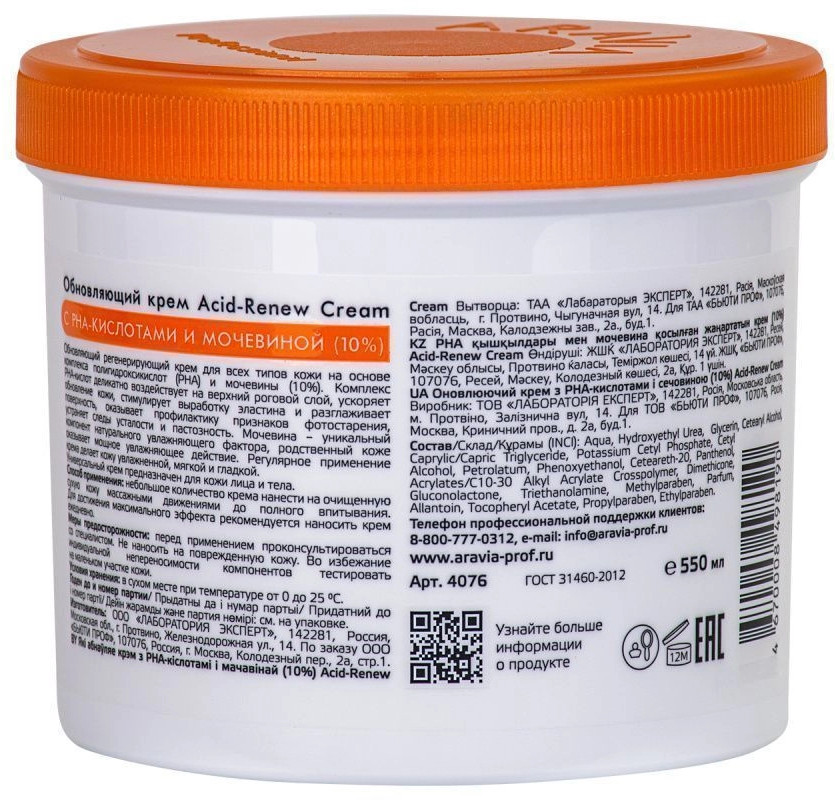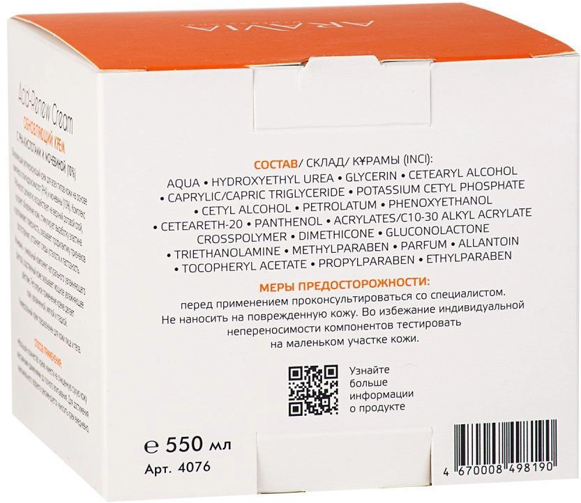 Aravia Крем обновляющий с PHA-кислотой и мочевинойувлажняет заживляет соответствует описанию В данный момент этот товар отсутствует в продаже. Возможно, у нас найдется аналогичный или похожий товар здесь. Обновляющий регенерирующий крем для всех типов кожи на основе комплекса полигидроксикислот (РНА) и мочевины (10%). Комплекс PHA-кислот деликатно воздействует на верхний роговой слой, ускоряет обновление кожи, стимулирует выработку эластина и разглаживает поверхность кожи, оказывает профилактику признаков фотостарения, устраняет следы усталости и пастозность. Мочевина — уникальный компонент натурального увлажняющего фактора, родственный коже оказывает мощное увлажняющее действие. Регулярное применение крема делает кожу увлажненной, мягкой и гладкой. Универсальный крем предназначен для кожи лица и тела. |