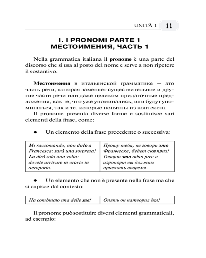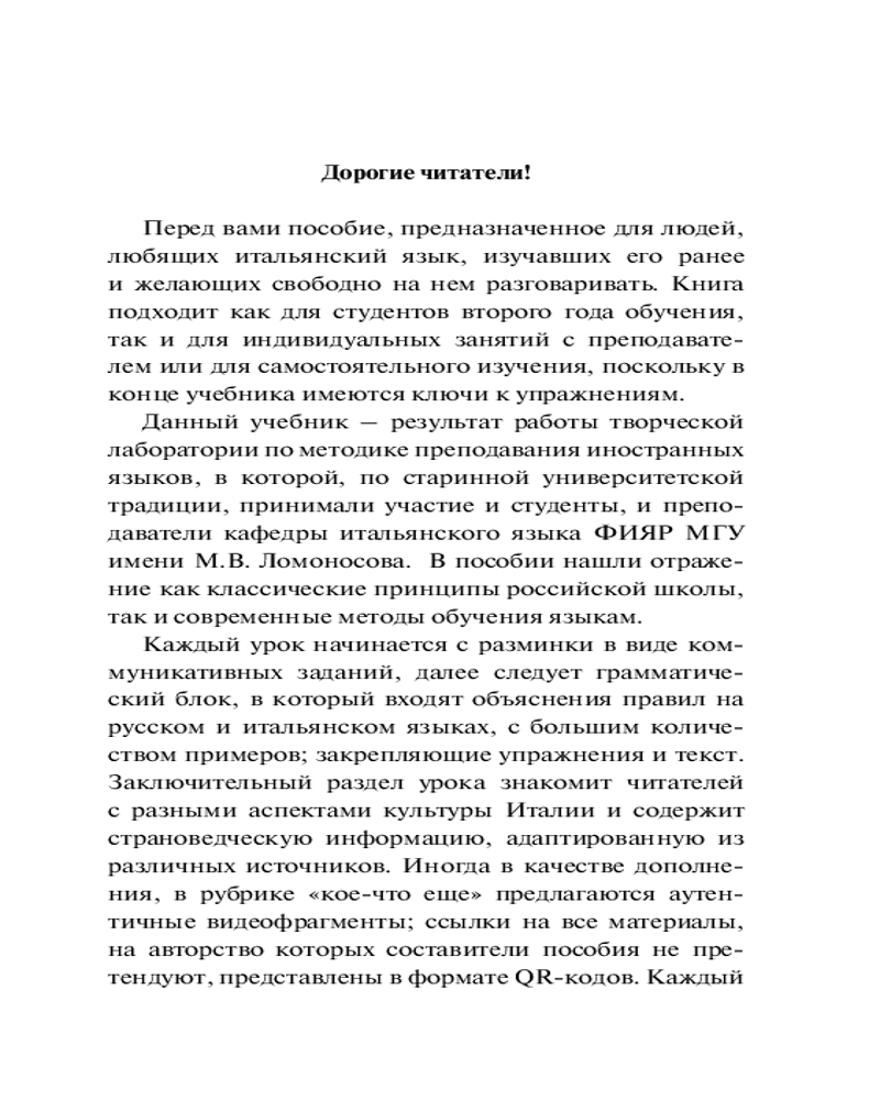 Каждый урок начинается с коммуникативных заданий, далее следует грамматический блок, в котором объясняются правила на русском и итальянском языках, с большим количеством примеров. Для закрепления полученных знаний даны упражнения и текст, в конце издания помещены ответы. Заключительный раздел урока знакомит читателей с разными аспектами культуры Италии и содержит страноведческую информацию. В качестве дополнения предлагаются аутентичные видеофрагменты. Ссылки на дополнительные материалы представлены в формате QR-кодов. Каждый блок дополнен глоссарием и лексическими упражнениями, помогающими обогатить словарный запас.