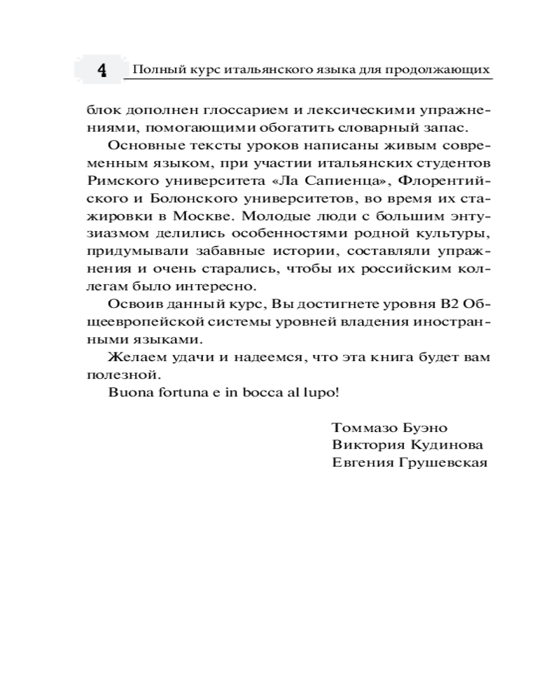 В данный момент этот товар отсутствует в продаже. Возможно, у нас найдется аналогичный или похожий товар здесь. Серия: Итальянский язык с Томмазо Буэно Томмазо Буэно — доктор филологии, получивший диплом Флорентийского университета. В течение 20 лет преподавал итальянский язык и культуру Италии в МГУ имени М. В. Ломоносова. Виктория Андреевна Кудинова — член координационного совета Ассоциации преподавателей итальянского языка в России (AILI), более 20 лет является преподавателем МГУ. Евгения Геннадьевна Грушевская — преподаватель МГУ и РАНХиГС, автор ряда учебных пособий.