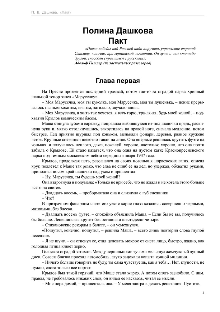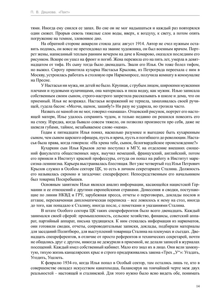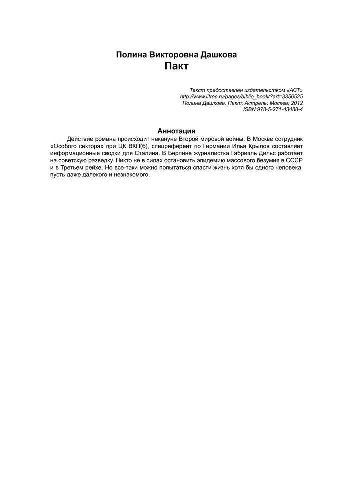 Пактпрописанные образы нет интриги твердый переплет В данный момент этот товар отсутствует в продаже. Возможно, у нас найдется аналогичный или похожий товар здесь. Действие романа происходит накануне Второй Мировой войны. В Москве сотрудник "Особого сектора" при ЦК ВКП(б), спец-референт по Германии Илья Крылов составляет информационные сводки для Сталина. В Берлине журналистка Габриэль Дильс работает на советскую разведку. Никто не в силах остановить эпидемию массового безумия в СССР и в Третьем Рейхе. Но все-таки можно попытаться спасти жизнь хотя бы одного человека, пусть даже далекого и незнакомого. "Это исторический роман, время действия 1937-41 годы, место: Москва и Берлин. Это моя личная попытка осмыслить ту трагедию, которая произошла в России в эти страшные и горестные годы. На эту тему написано море исследований, я изучаю документы, подолгу сижу в архивах. Но я пишу не исследование, а беллетристику, где есть сюжет и герои с их характерами, переживаниями, мыслями…". Полина Дашкова |