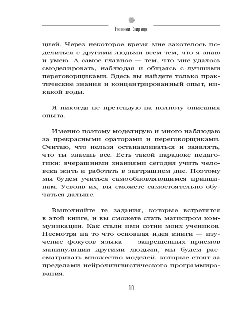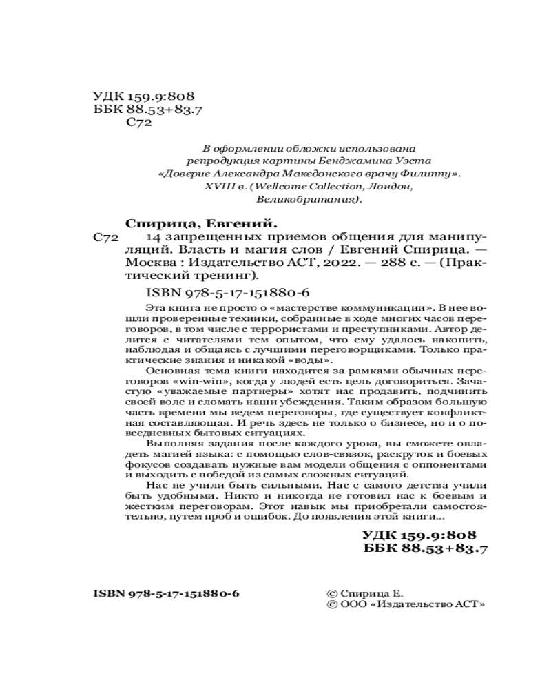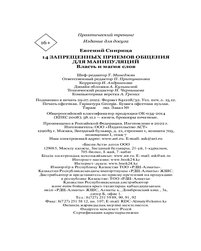 💳 Оплатить за товар можно при получении 🇰🇿 Есть бесплатная доставка по Казахстану от 1 дня 🎁 Копите бонусы с каждой покупки Серия: Практический тренинг Евгений Спирица — эксперт-верификатор, профайлер, бизнес-консультант, переговорщик со стажем более 20 лет. Владеет навыками боевого и жесткого НЛП, вербовки. Работал в специальном подразделении ОМОНа, где вел переговоры с криминальными боссами. |