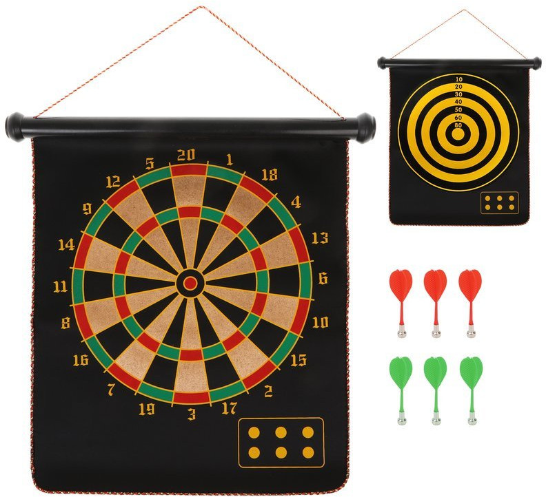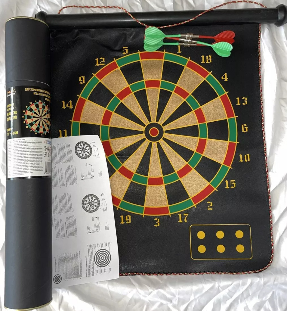 Данная модель дартс подходит для самых юных игроков. Набор включает плотное полотно с круглой мишенью, изображенной на обеих его сторонах (2 вида), а также 6 магнитных дротиков без иголок. В отличие от дротиков с металлическим наконечником, такие снаряды безопасны для использования маленькими детьми. Цель игрока заключается в метании дротиков в круглую мишень, заранее подвешенную на стену. Мишень поделена на сектора, попадание в каждый из которых соответствует набору определённого количества очков. Наилучшим результатом считается попадание в так называемое «яблочко», расположенное в самом центре мишени.