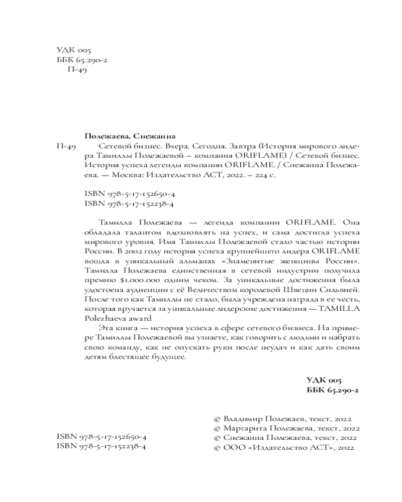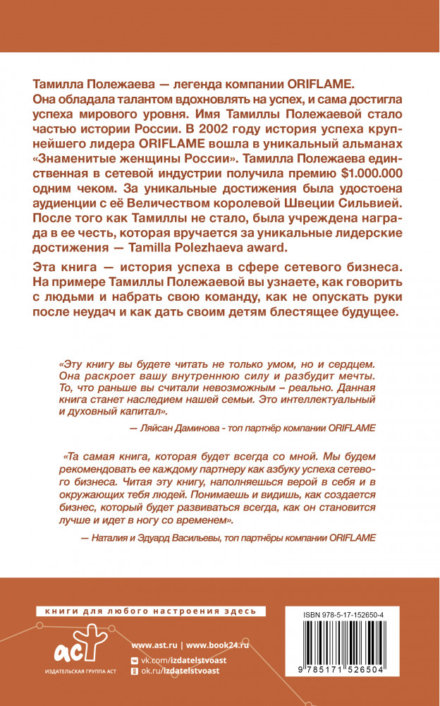 Сетевой бизнес. История успеха легенды компании OriflameСнежанна Полежаева, Тамилла Полежаева, Владимир Полежаев В данный момент этот товар отсутствует в продаже. Возможно, у нас найдется аналогичный или похожий товар здесь. Серия: Бизнес-бук Тамилла Полежаева — легенда компании Oriflame. Она обладала талантом вдохновлять на успех, и сама достигла успеха мирового уровня. Имя Тамиллы Полежаевой стало частью истории России. |