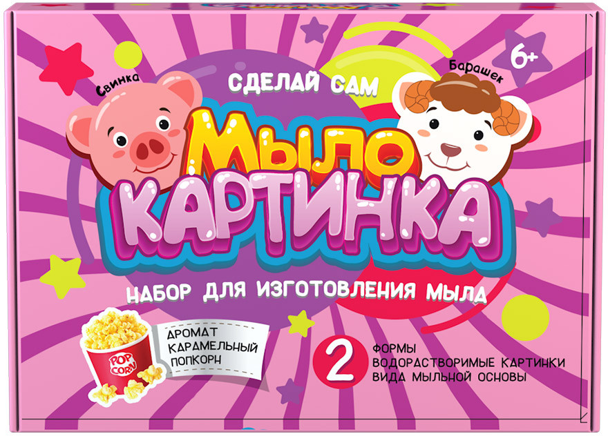 Этот набор поможет создать ароматное мыло с картинками внутри! Новая технология изготовления мыла позволяет своими руками сделать объемное мыло с картинкой, которая смывается водой! В результате опыта у вас получится 2 кусочка мыла собственного производства с приятным ароматом. Собери всех животных в свою коллекцию! Отличный вариант для совместного досуга с ребенком, а результат эксперимента можно вручить близким людям в качестве презента. Подходит для подарка детям от 6 лет и старше — в детский сад или школу.