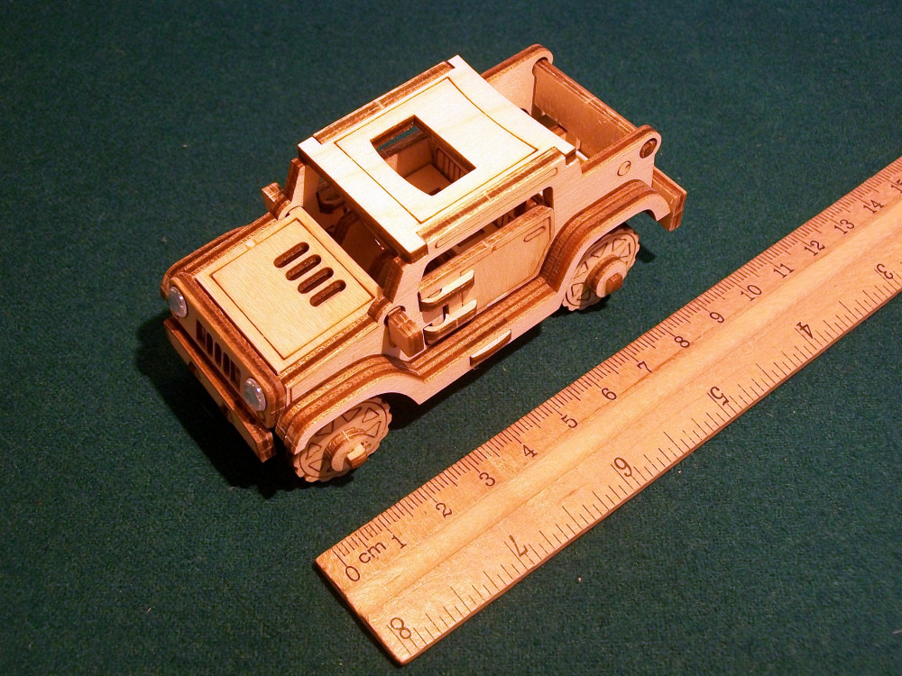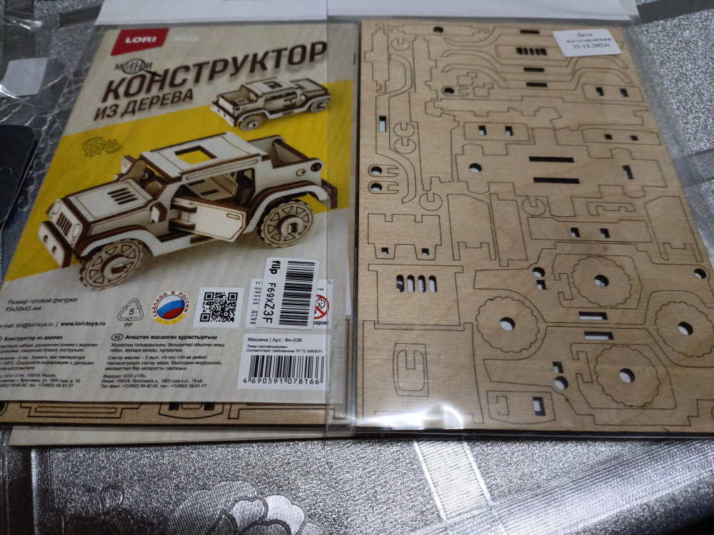 В комплект входят детали из фанеры, наждачная бумага и подробная инструкция. Модель небольшого размера, но имеет много подвижных деталей - в собранном виде у машины вращаются колёса (можно катать), открываются двери и капот, открывается задний борт кузова. В процессе сборки детали соединяются очень крепко, некоторые детали нужно подтачивать наждачной бумагой. На собранную модель, в те места, где находятся фары, я наклеил имевшиеся у меня стразы походящего размера. Данную модель я заказывал по почте, оплата наложенным платежом. Посылка была хорошо упакована, товар доставлен в полной сохранности. Большое спасибо сотрудникам интрнет-магазина "Flip.kz" за хорошо выполненную работу!