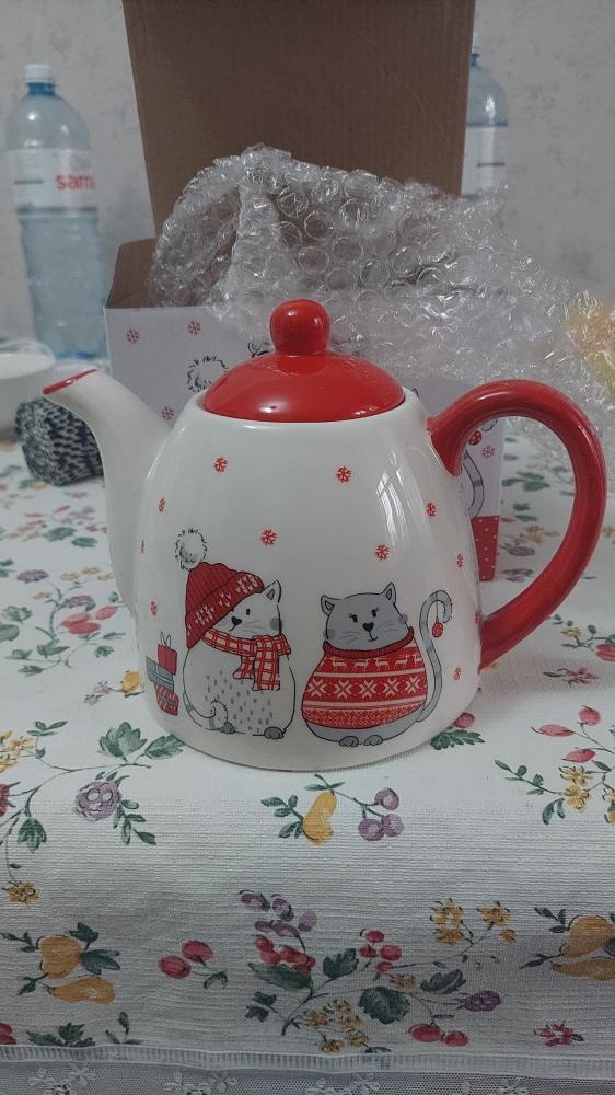 Чайник очень красивый- удобный.Чай в нём вкусно заваривается.Рисунок 👍Котики милые.Хороший подарок на новый год.