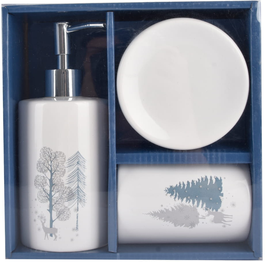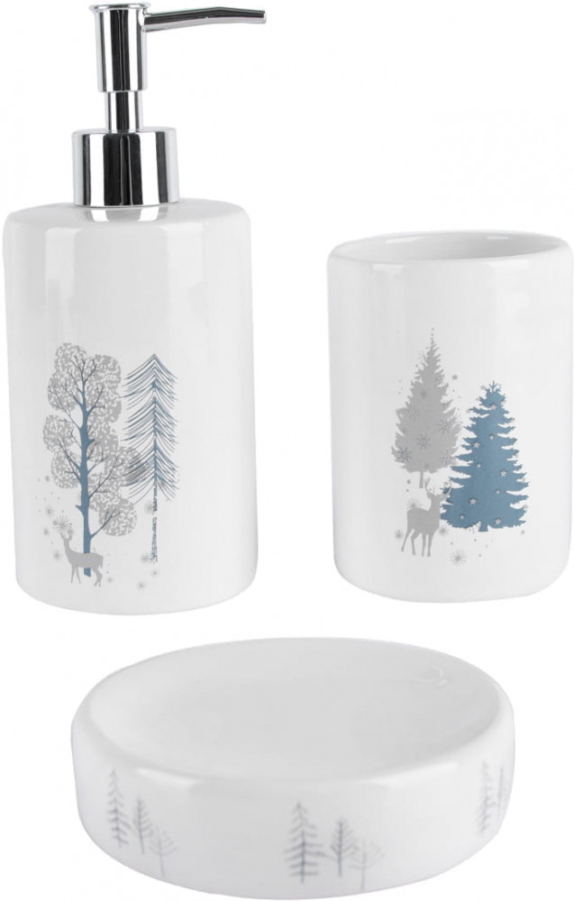 Набор состоит из 3-х предметов. Диспенсер можно использовать для мыла, шампуня, массажного масла или бальзамов. В стакане можно разместить зубные щетки, пасту, крема или мази и другую необходимую косметику. Такой набор сможет стать стильным дополнением ванной комнаты.