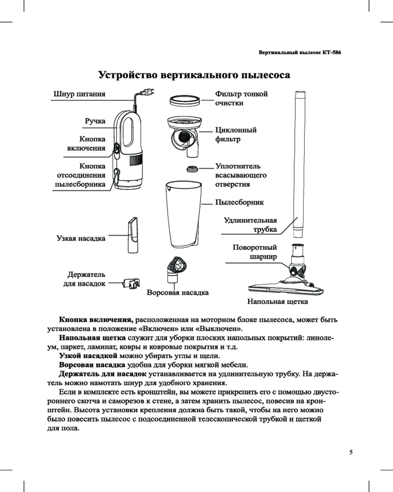 Вертикальный пылесос комплектуется специальным держателем для насадок, который крепится на удлинительную трубку. На него также можно намотать шнур.