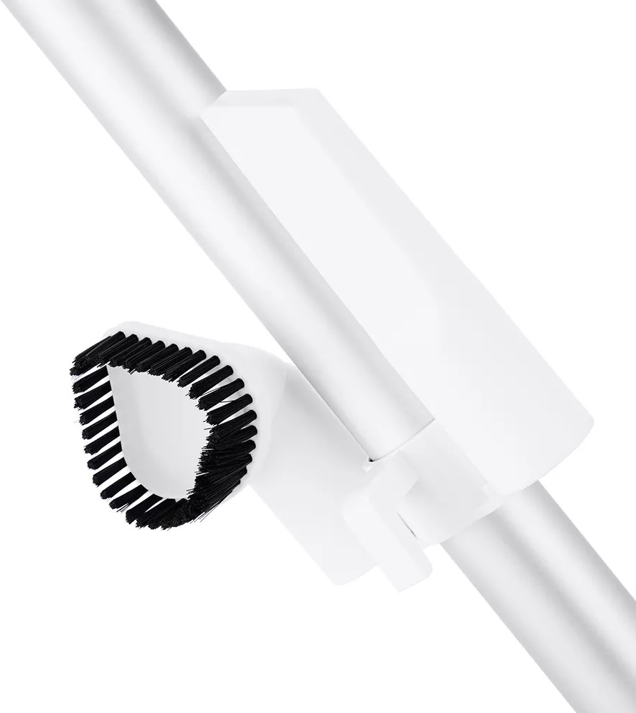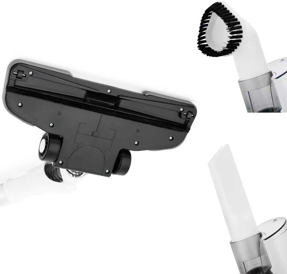 В комплекте с вертикальным пылесосом идут напольная щётка для уборки плоских напольных покрытий, узкая насадка для уборки углов и щелей и ворсовая насадка, которая удобна для чистки мягкой мебели.