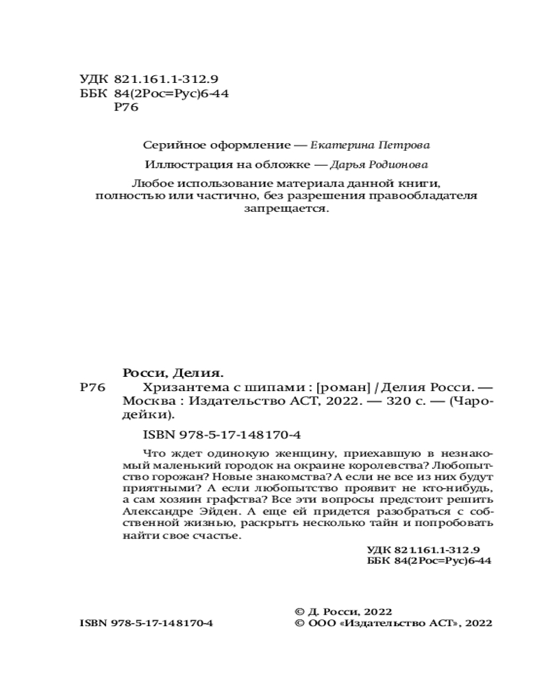 💳 Оплатить за товар можно при получении 🇰🇿 Есть бесплатная доставка по Казахстану от 1 дня 🎁 Копите бонусы с каждой покупки Серия: Чародейки Что ждет одинокую женщину, приехавшую в незнакомый маленький городок на окраине королевства? Любопытство горожан? Новые знакомства? А если не все из них будут приятными? А если любопытство проявит не кто-нибудь, а сам хозяин графства? Все эти вопросы предстоит решить Александре Эйден. А еще ей придется разобраться с собственной жизнью, раскрыть несколько тайн и попробовать найти свое счастье. |