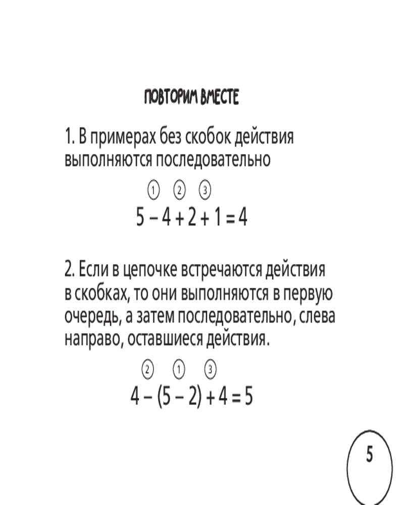 — сложение и вычитание со скобками и без скобок в пределах 10 и 20;