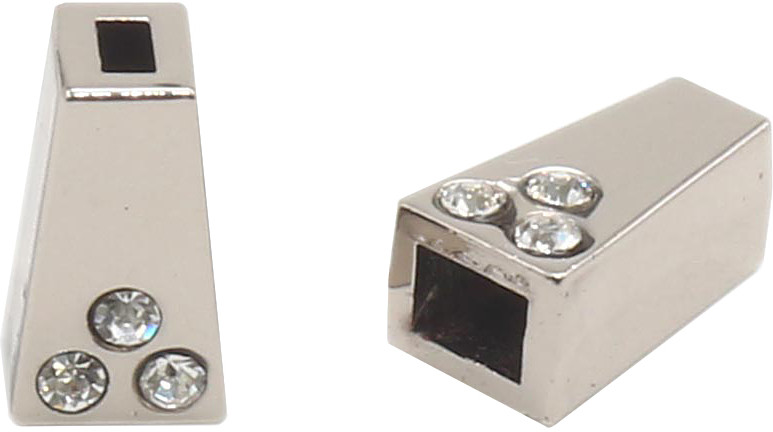 Металлический четырехгранный наконечник со стразами для шнура. Используется при шитье одежды для спорта и отдыха, детской одежды. Размер: 11 × 6,5 мм, диаметр отверстий 2,5/4 мм.