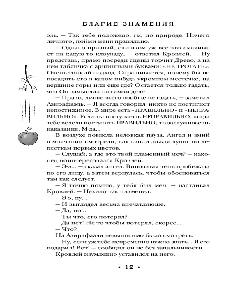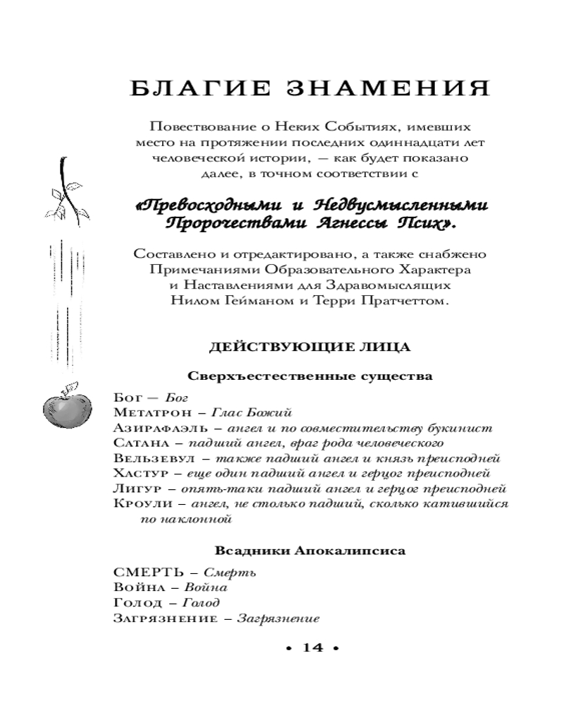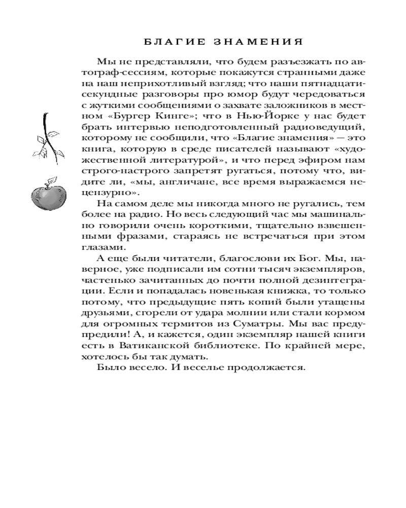 Благие знаменияиллюстрации белая бумага обложка верстка В данный момент этот товар отсутствует в продаже. Возможно, у нас найдется аналогичный или похожий товар здесь. Серия: Магия Терри Пратчетта в иллюстрациях Полины Граф Мир закончится в субботу. В следующую субботу на самом деле. Где-то перед ужином. Армии Добра и Зла приведены в готовность к Армагеддону. Атлантида поднялась со дна морского. Жабы падают с небес. Четыре Всадника Апокалипсиса уже оседлали свои «Харлеи». Всё идёт по Божественному Плану... за исключением того, что младенца Антихриста подменили и потеряли сразу после рождения. А один ангел и один демон за 6000 лет полюбили жизнь среди людей — и теперь саботируют наступление Конца Света... |