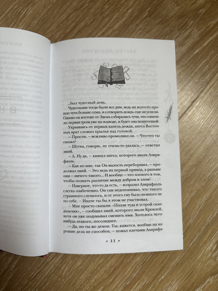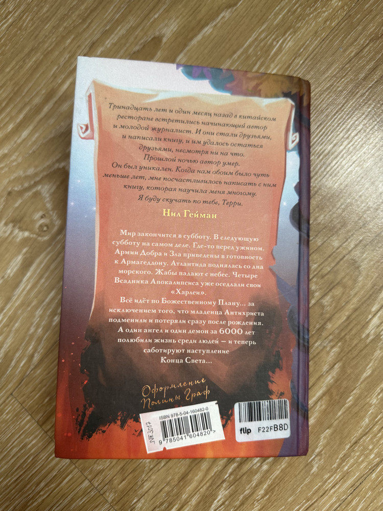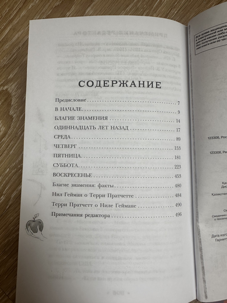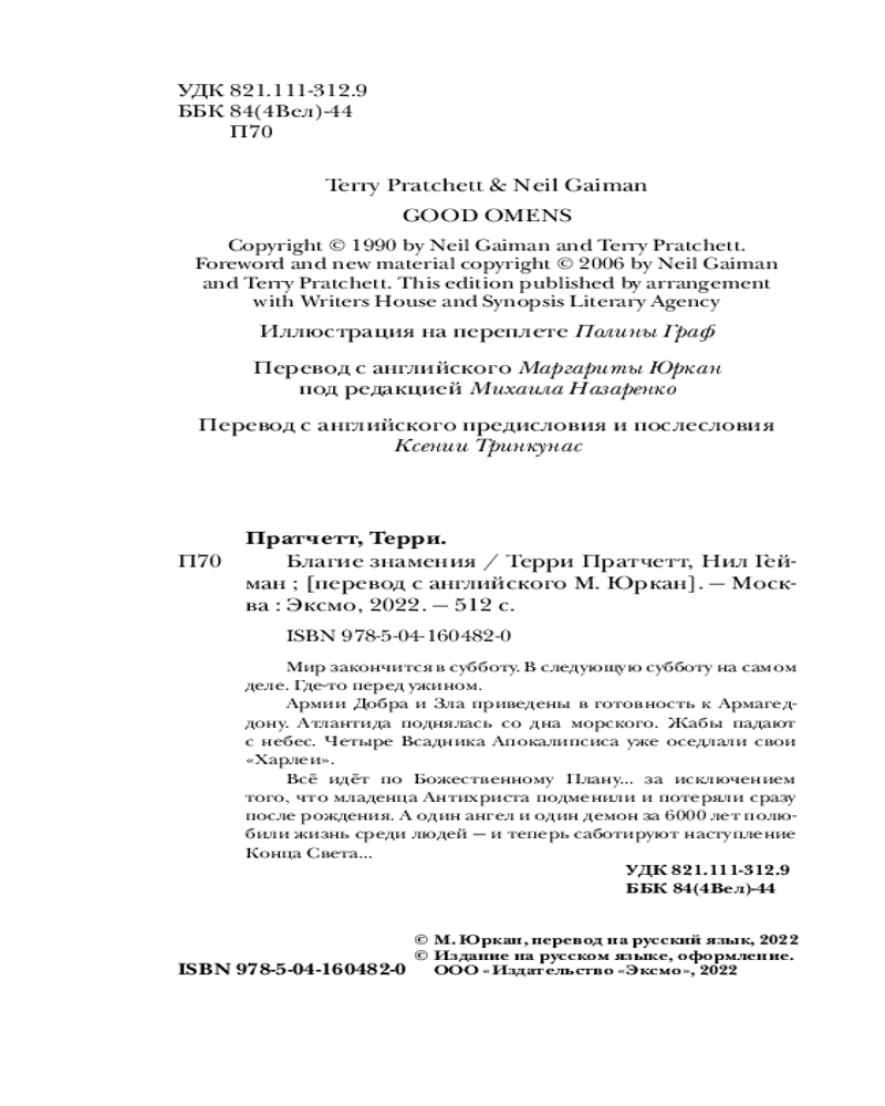 История отличная, добрая, смешная, поучительная. Обычно после прочтения книг Терри П., у меня оставался осадок грусти, печали (в хорошем смысле этого слова), однако в этот раз, такого не было на удивление. Может потому что история полностью законченная и не подразумевает продолжения. Как это можно объяснить?!...Ощущается чувство сытости после прочтения. Это моя первая прочтенная книга, написанная двумя авторами и первая Нила Г., могу сказать что, ощутимые отличия имеются в манере написания той или иной части книги. Так как манеру толкования Терри я обожаю, сначала была расстроена тем, что приправа истории не та, но после, поняла что это и есть изюминка этой книги. Что двое авторов из разных жанров создали гармоничную, живущую свой жизнью историю.