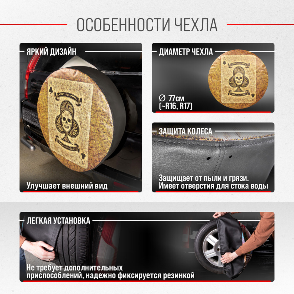 Чехол на запасное колесо автомобиля из прочного и легко моющегося материала. Экокожа и полиэстер сохраняют свою форму, устойчивы к воздействиям окружающей среды. Чехол защищает запасное колесо от проникновения пыли, возможных загрязнений, солнечных лучей и агрессивных веществ. Яркий дизайн изделия привлекает внимание. Аксессуар улучшает внешний вид автомобиля, делает его более интересным и лаконичным. Подходит для городских и полевых условий. Чехол с легкостью надевается на колесо, не требуя дополнительных приспособлений.