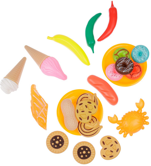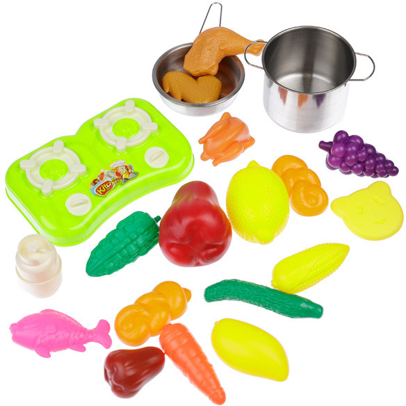 Большой игровой набор «Кухня» в корзинке. В наборе представлены овощи, фрукты, продукты, готовая еда и посуда — большой простор для игр. В сюжетно-ролевой игре ребенок развивает воображение и мыслительную деятельность.