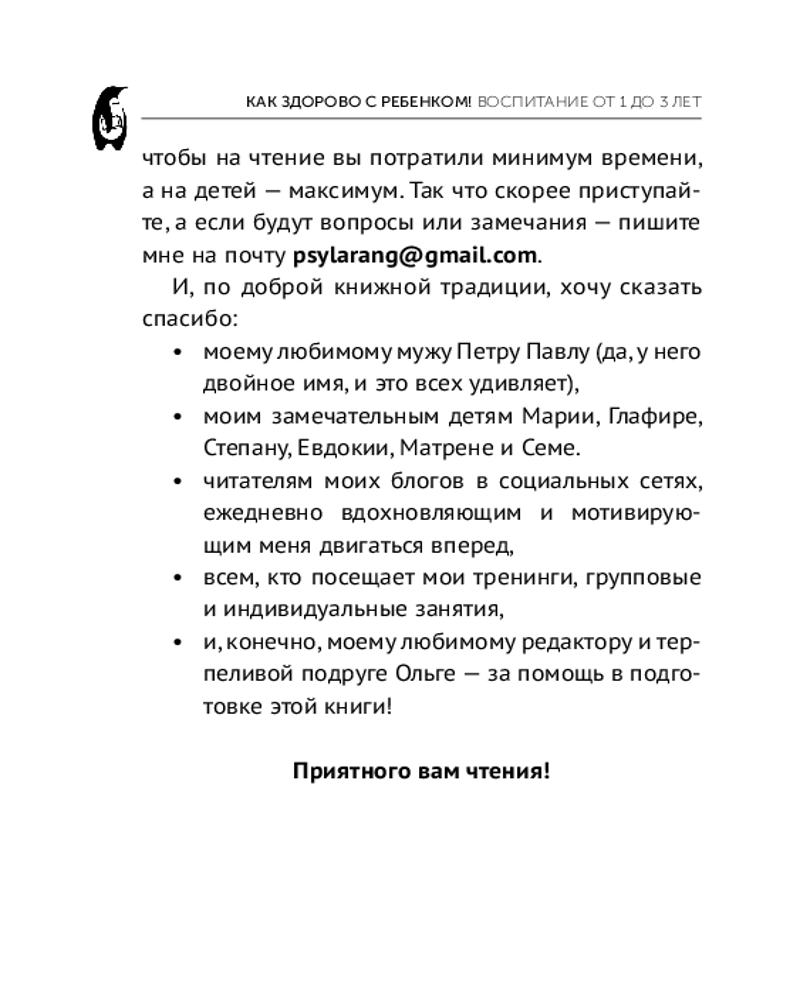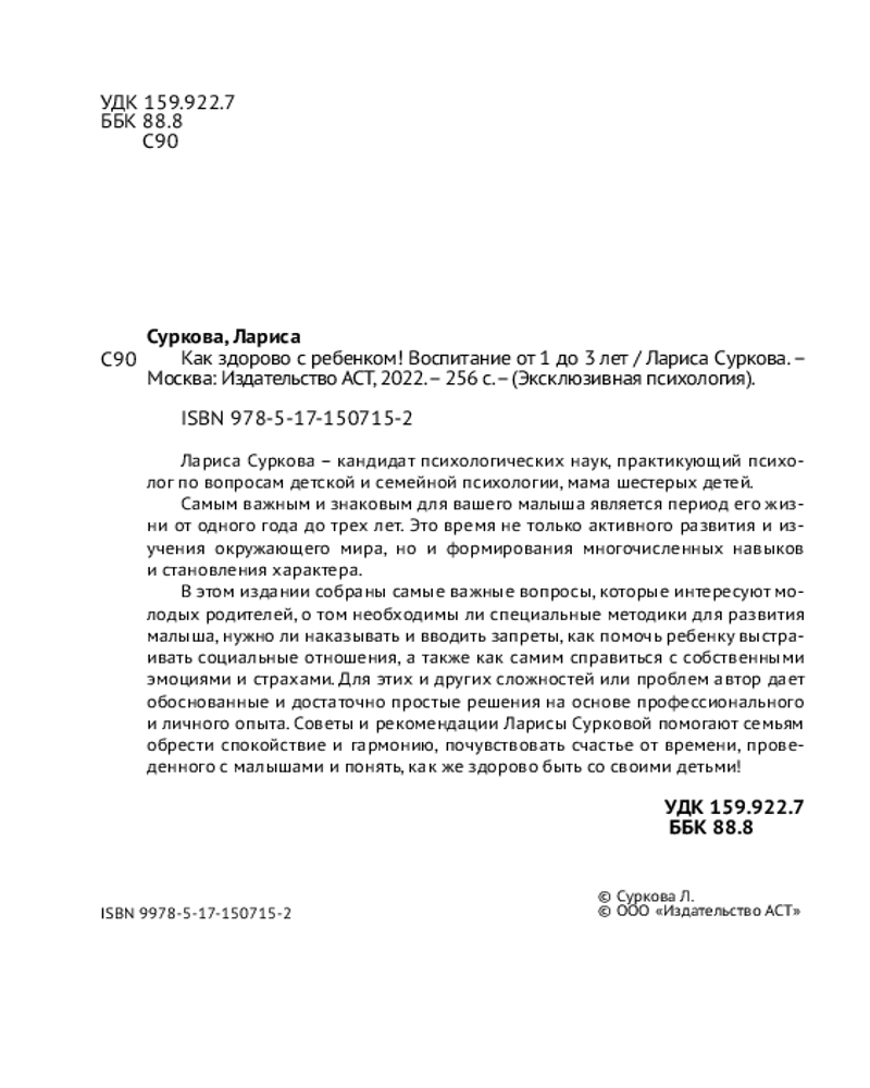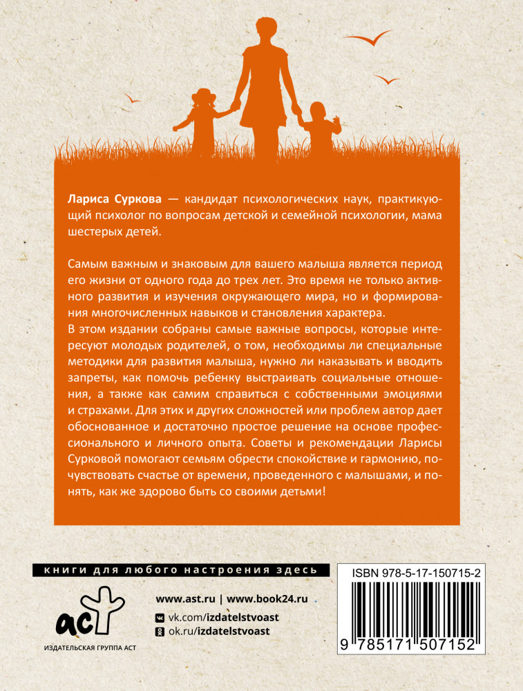 Для этих и других сложностей или проблем автор дает обоснованные и достаточно простые решения на основе профессионального и личного опыта. Советы и рекомендации Ларисы Сурковой помогают семьям обрести спокойствие и гармонию, почувствовать счастье от времени, проведенного с малышами и понять, как же здорово быть со своими детьми! |