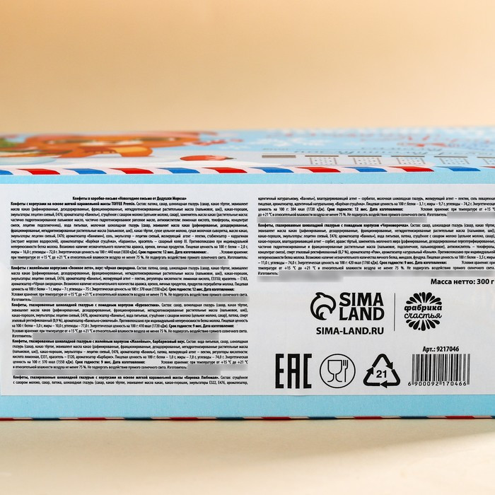 Конфеты, глазированные шоколадной глазурью с помадным корпусом «Черноморочка»: сахар, шоколадная глазурь (сахар, какао тёртое, эквивалент масла какао (рафинированные, дезодорированные, фракционированные, негидрогенизированные растительные масла (пальмовое, ши)), какао-порошок, эмульгаторы: лецитин соевый, Е476; ароматизатор «Ваниль»), вода питьевая, патока, сгущённое с сахаром молоко (цельное молоко, сахар), какао-порошок, влагоудерживающий агент – сорбит, арахис тёртый, заменитель молочного жира (рафинированные, дезодорированные переэтерифицированные, частично гидрогенизированные и фракционированные растительные масла (пальмовое, подсолнечное, пальмоядровое), антиокислитель – токоферолы, концентрат смеси), спирт этиловый ректификованный (0,7 %), ароматизатор «Ром», ароматизатор натуральный «Коньяк». Противопоказано при индивидуальной непереносимости белка молока. Возможно наличие незначительного количества яичного белка, миндаля, фундука.