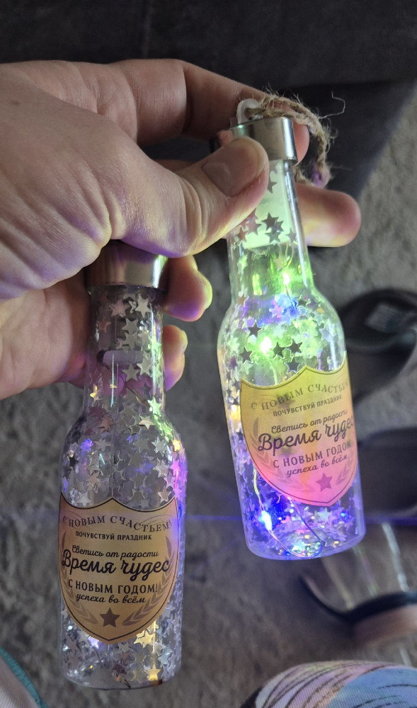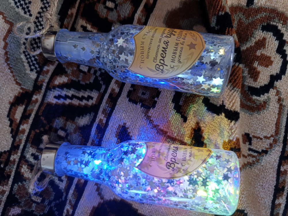 Одна бутылочка не горит, клей внутри затек и проволока заржавела, вторая бутылочка помятая.
