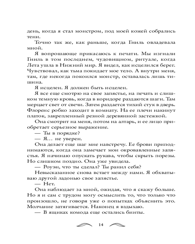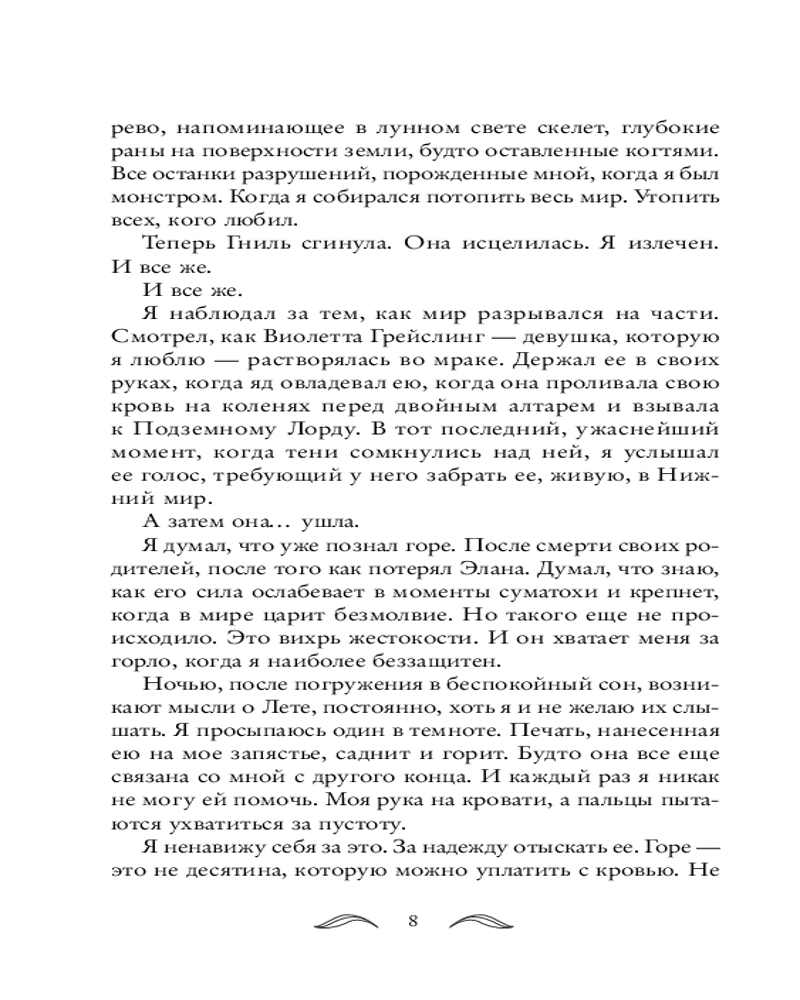Но мир теней и тумана скрывает множество тайн. Когда Виолетта поймет, что они с Роуэном все еще связаны заклинанием, девушка рискнет всем, даже собственной душой, чтобы узнать, как покинуть подземный мир и вернуться домой. То, что они сделали, оставило шрамы. Выбирая между властью и любовью, жизнью и смертью, Виолетта все сильнее попадает под чары Нижнего мира и Подземного Лорда. |