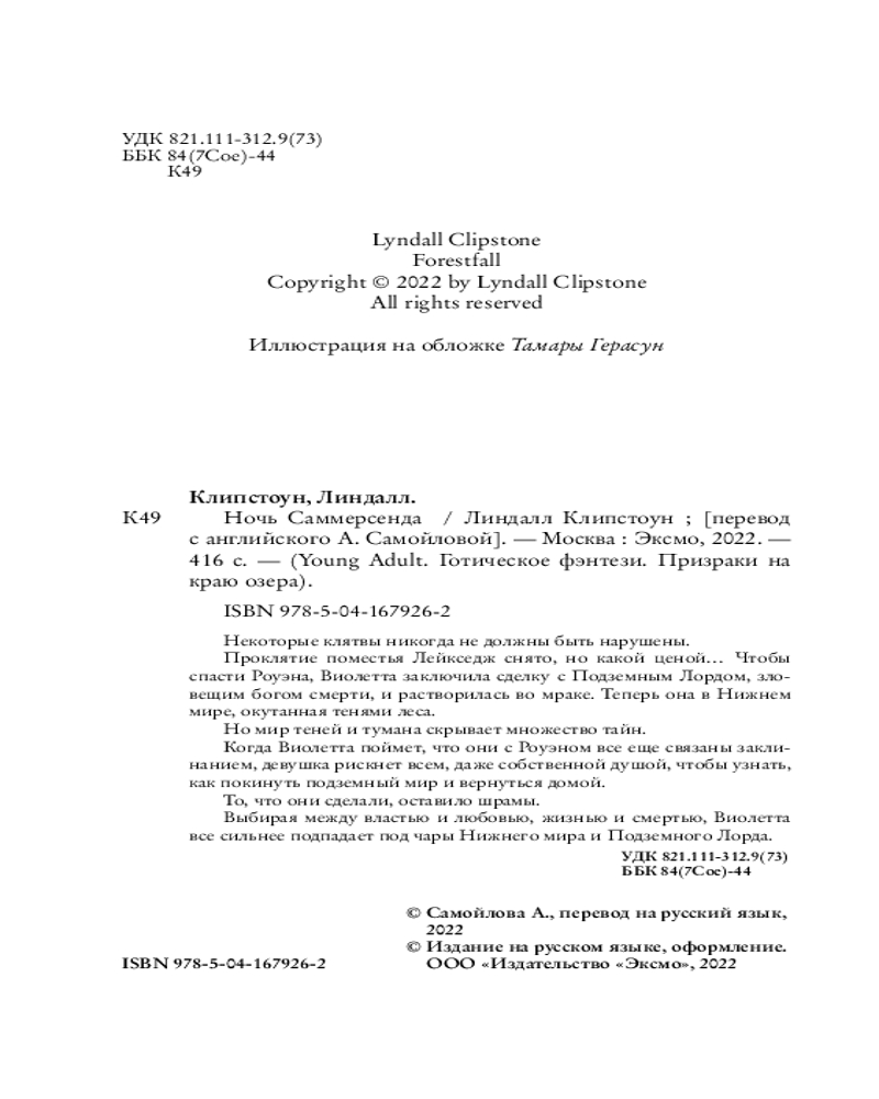 В данный момент этот товар отсутствует в продаже. Возможно, у нас найдется аналогичный или похожий товар здесь. Серия: Young Adult. Готическое фэнтези. Призраки на краю озера Некоторые клятвы никогда не должны быть нарушены. Проклятие поместья Лейкседж снято, но какой ценой... Чтобы спасти Роуэна, Виолетта заключила сделку с Подземным Лордом, зловещим богом смерти, и растворилась во мраке. Теперь она в Нижнем мире, окутанная тенями леса.