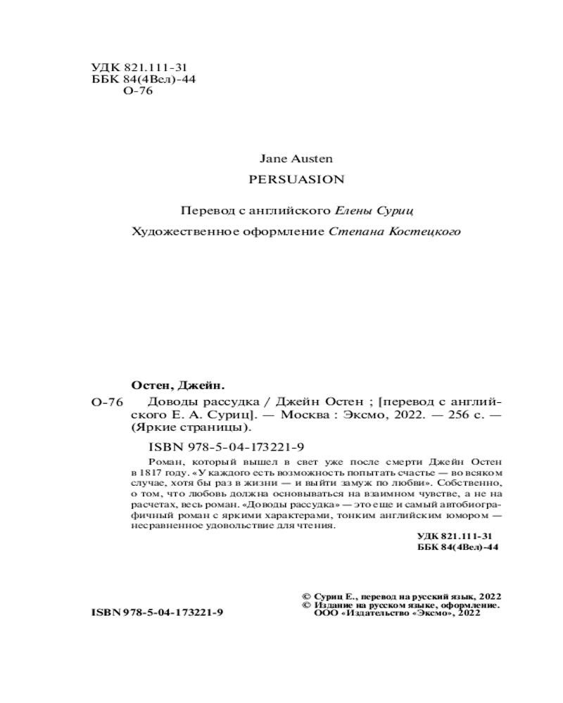 💳 Оплатить за товар можно при получении 🇰🇿 Есть бесплатная доставка по Казахстану от 1 дня 🎁 Копите бонусы с каждой покупки Серия: Яркие страницы Впервые опубликованный в 1818 году, роман «Доводы рассудка» был последней работой Джейн Остен. Действие происходит в графстве Сомерсет и в Бате. |